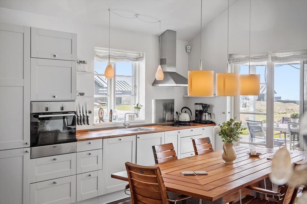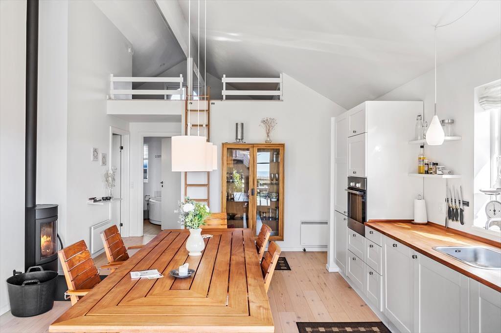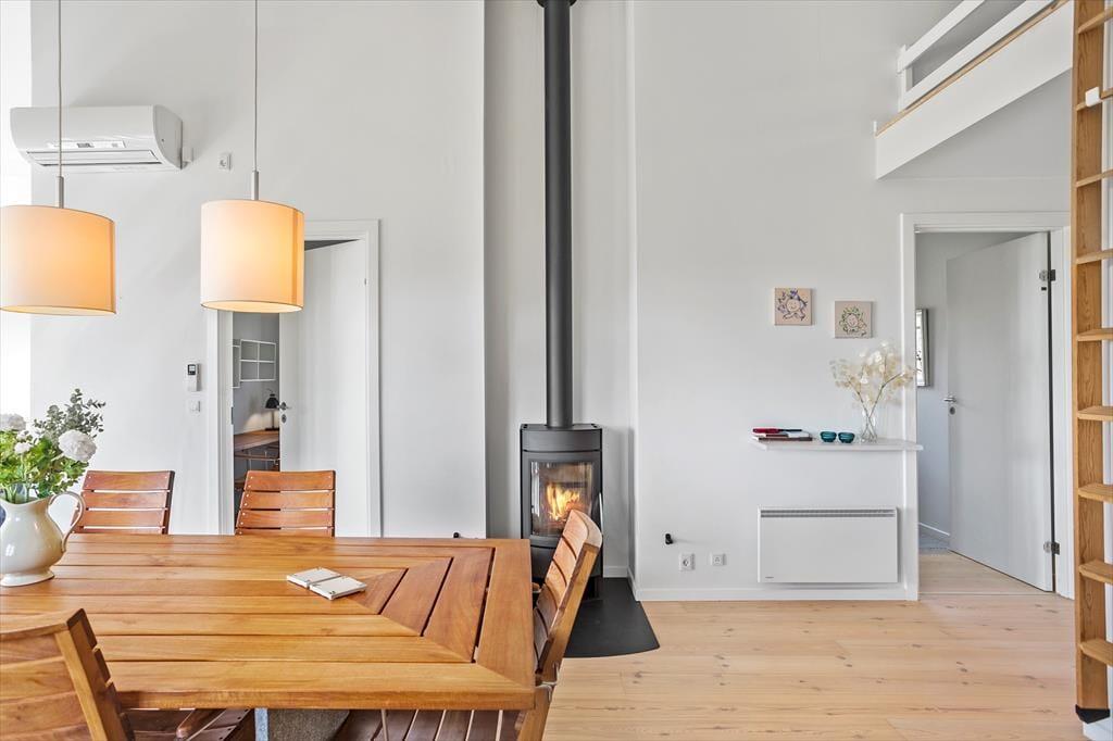Badeværelse med bruser, wc, spabad og sauna. Et lækkert køkken-alrum med spiseafdeling lige ved køkkenet, samt brændeovn og varmepumpe, desuden en hyggelig stue med tv, samt 2 udgange fra køkken og stue til en fantastisk delvis overdækket terrasse hvor man kan nyde den skønne udsigt til havet.