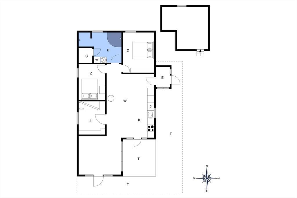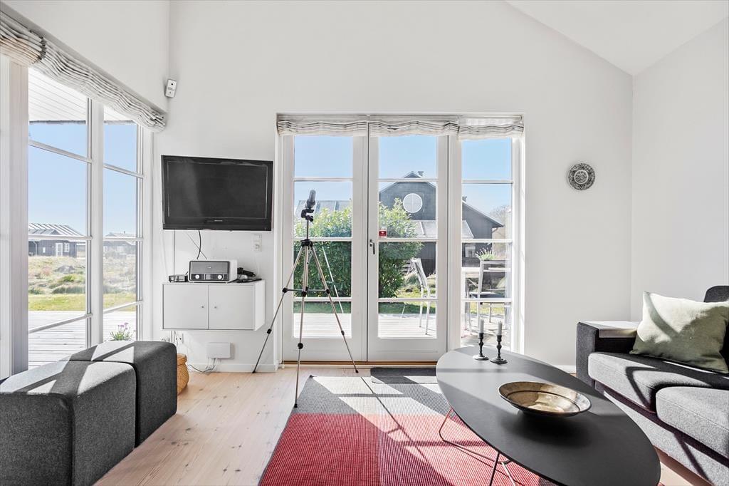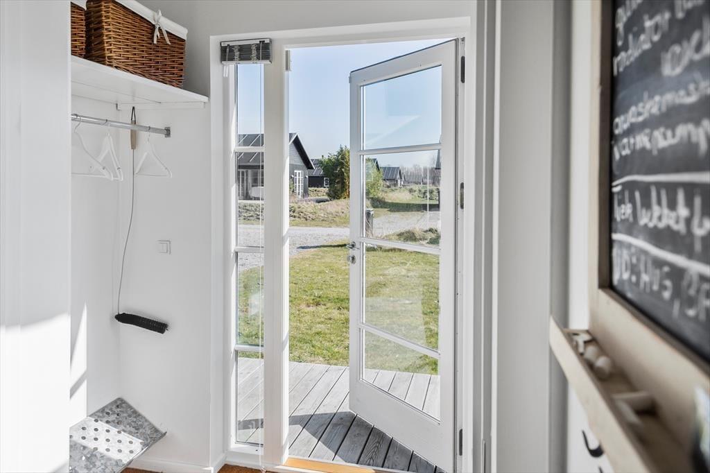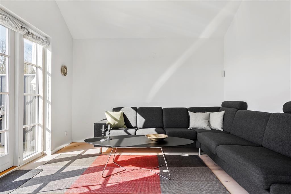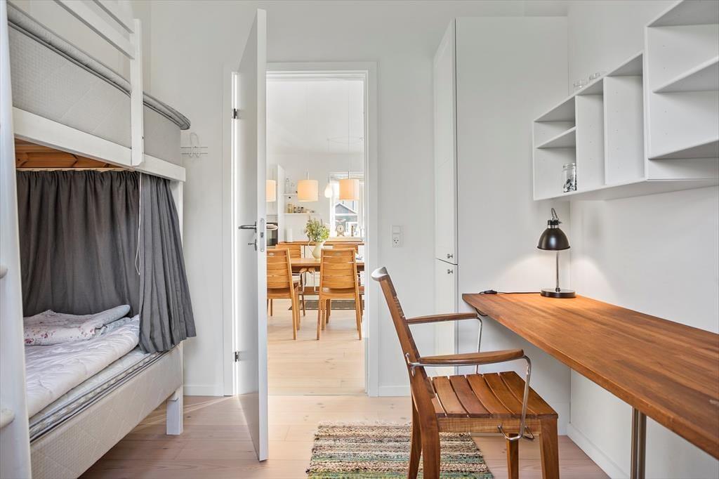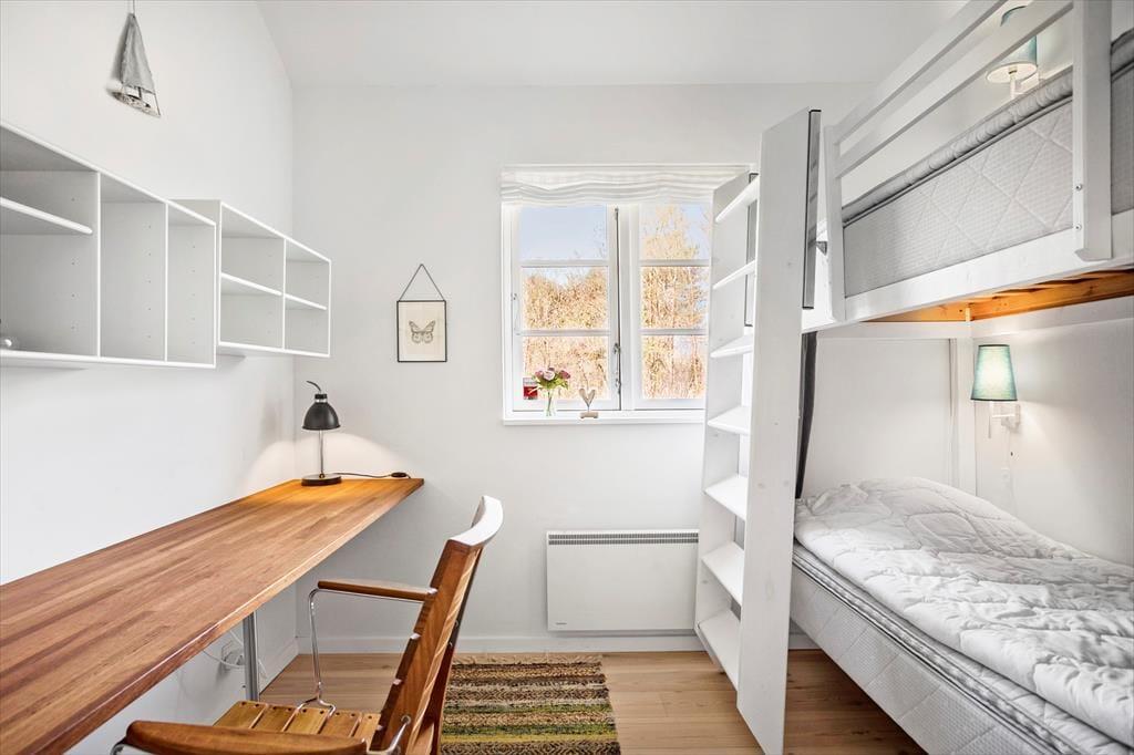 Fritidshuset indeholder: Lys entre, 3 gode soveværelser, 2 soveværelser med dobbeltsenge og 1 soveværelse med køjeseng, samt en hems med 2 madrasser.