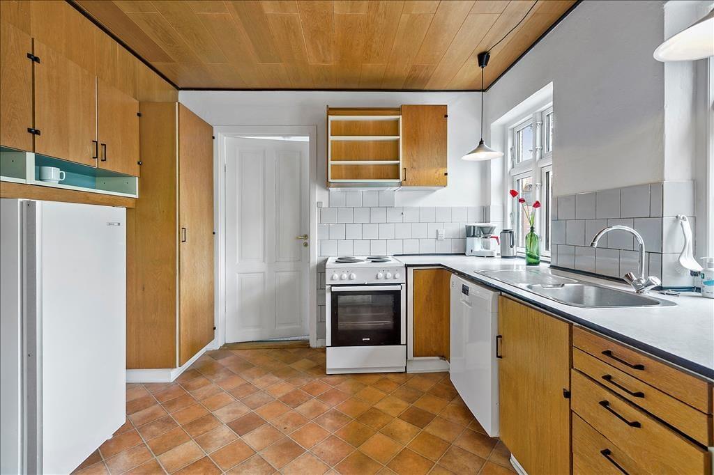 Fritidshuset indeholder: Entre, 3 soveværelser, 1 soveværelser i stueplan med dobbeltseng og 2 soveværelser på 1.sal, det ene med dobbeltseng og det andet med 2 enkeltmandssenge. Køkken med opvaskemaskine, køleskab med frys osv., bryggers med vaskemaskine, 2 badeværelser, det ene kun med WV og det andet med WC og bruser, stor stue med spiseafdeling og sofaområde.