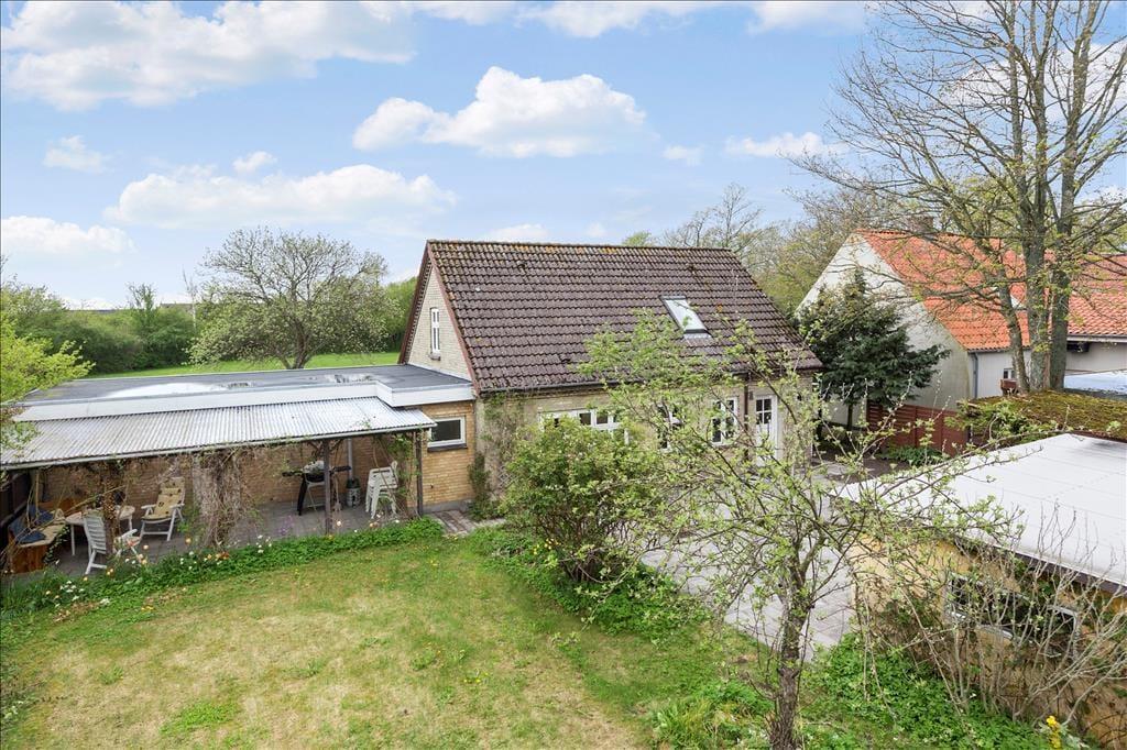 Fritidshuset er beliggende på en 800 kvm stor og lukket grund. Her er der en hyggeligt overdækket terrasse, som man kan komme til og fra via. det ene soveværelse. Samt en stor stenterrasse som ikke er overdækket og en hyggelig have til leg og spil.