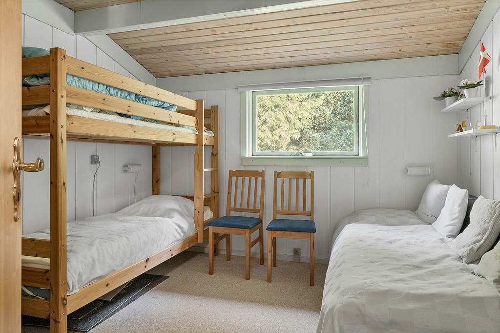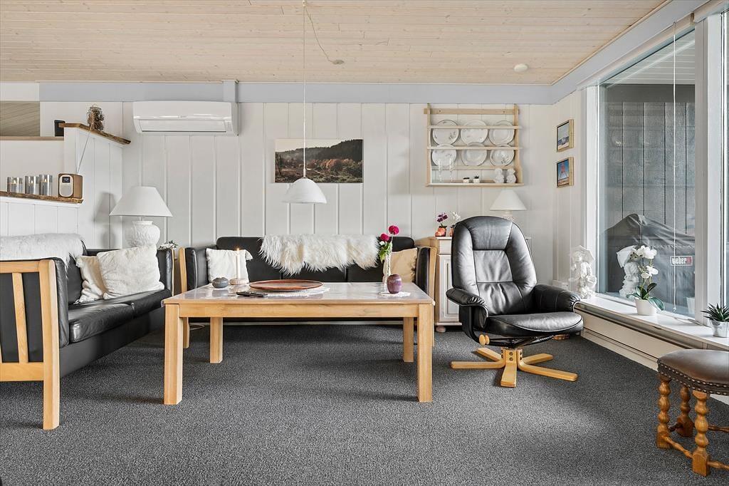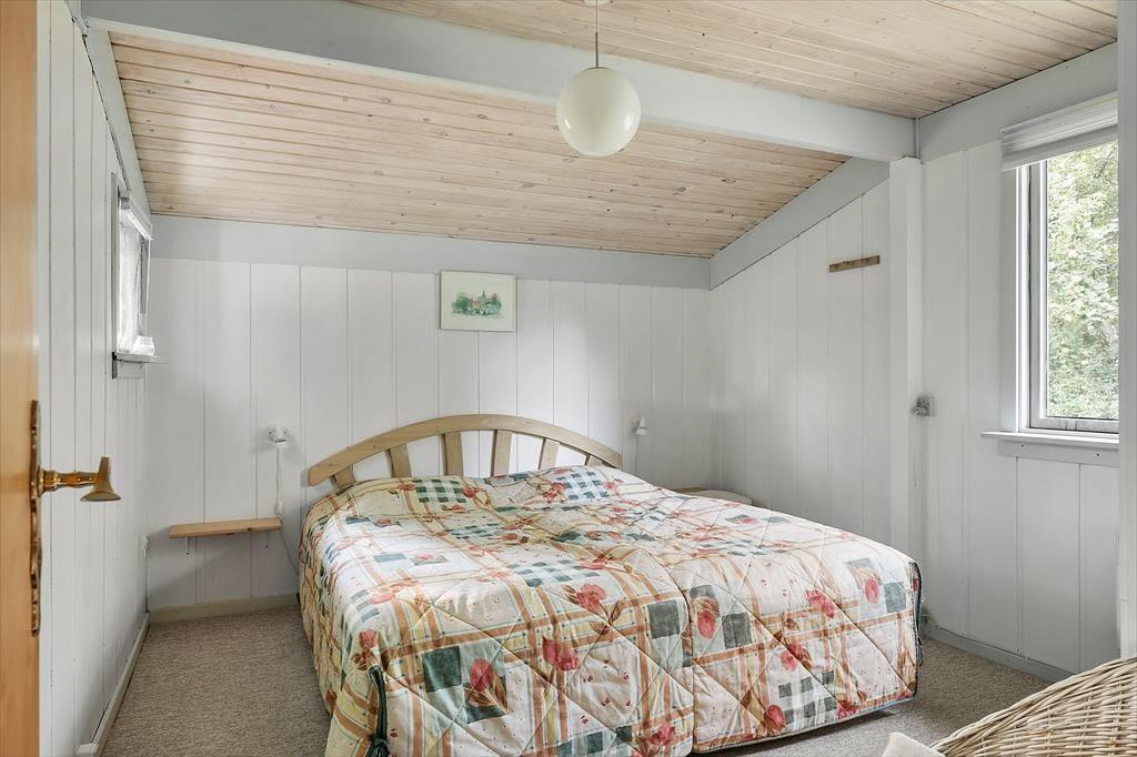 Det 71 m2 store sommerhus er blevet grundigt renoveret i 2019, hvilket det flotte køkken og andre dejlige indretningsdetaljer tydeligt vidner om. Netop køkkenet ligger i åben forbindelse med stuen, der byder på spisebord og sofaafdeling med tv – samt en energibesparende varmepumpe foruden den hyggespredende brændeovn. Et pænt badeværelse med bruser og gulvvarme hører med til planløsningen, og når det er ved at være sengetid, kan I gøre brug af husets to soveværelser, der har sengepladser til fem personer.