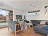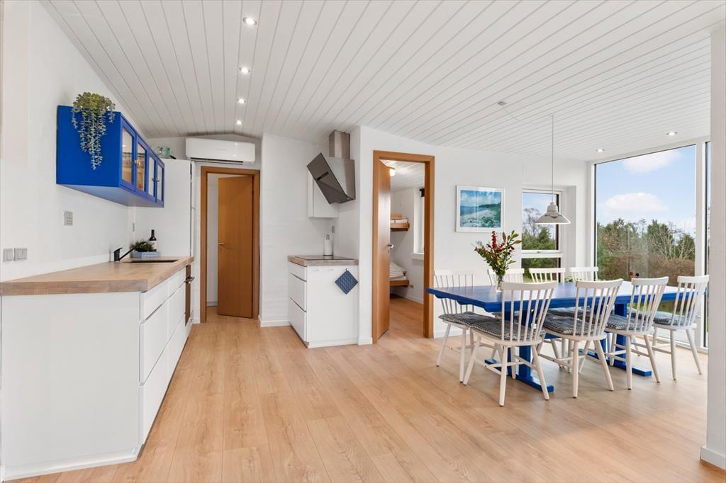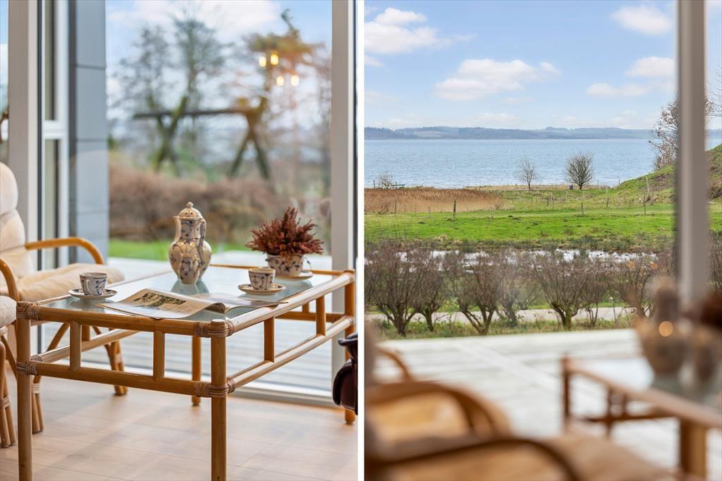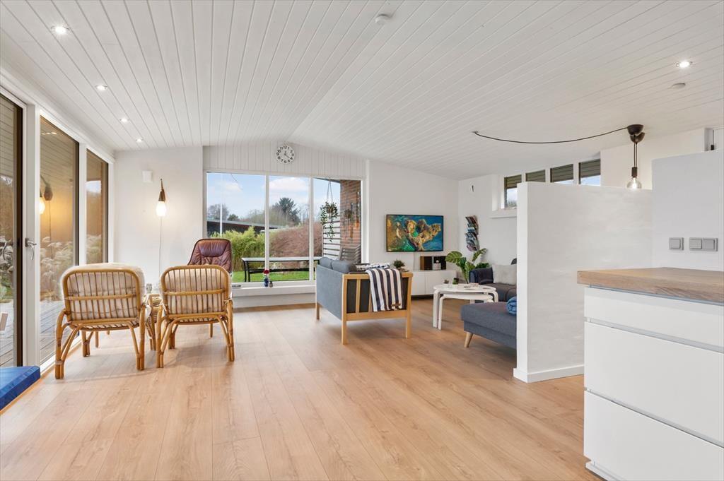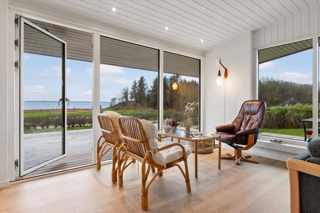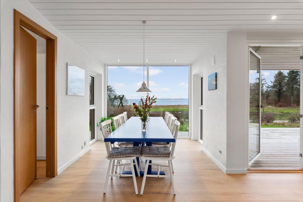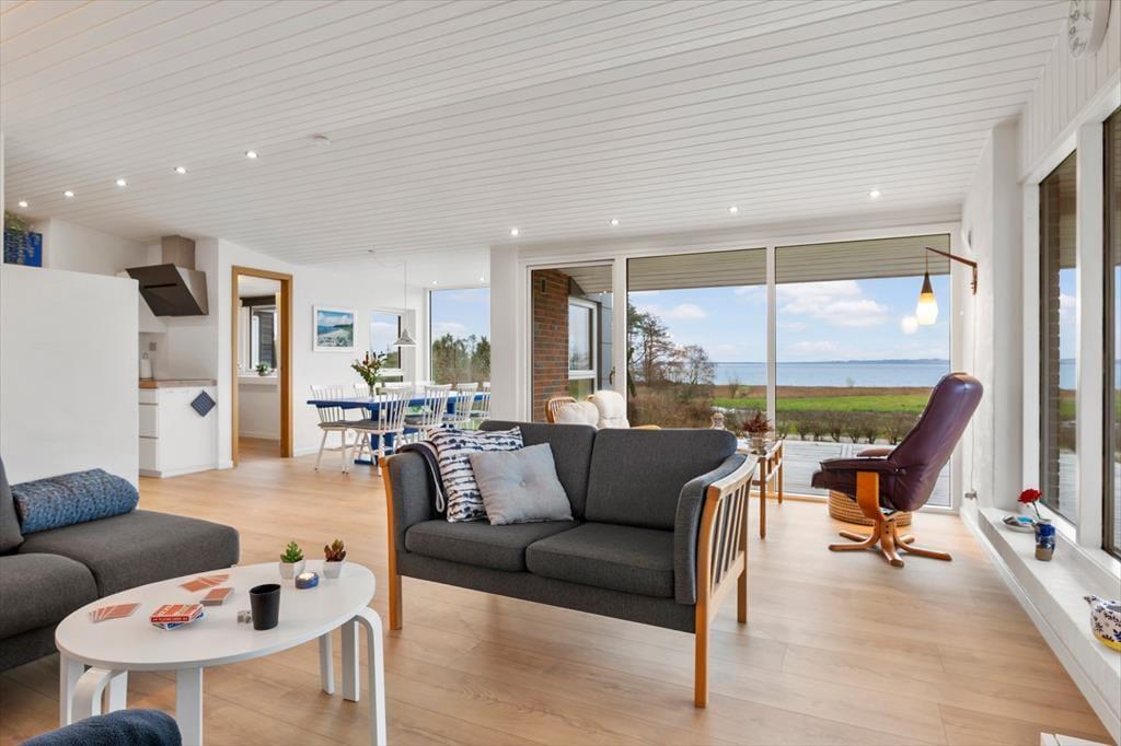 Indenfor mødes du af en lys, moderne og indbydende indretning, hvor rummene føles åbne og lette, og hvor dagslyset strømmer ind og fremhæver den afslappede feriestemning. Stuen er husets naturlige samlingspunkt, og her er det oplagt at slå sig ned med en kop kaffe, mens blikket glider ud over Limfjordens skiftende farver. Panoramaudsigten giver en særlig ro, som gør det let at koble helt af fra hverdagens tempo. Køkken og opholdsrum ligger i åben forbindelse, så samtalerne kan flyde frit, uanset om der bliver dækket op til fælles måltider eller spillet brætspil ved spisebordet. Når dagen går på hæld, kan du trække dig tilbage og nyde stilheden, der kun brydes af vindens susen og de dæmpede lyde fra naturen omkring huset.