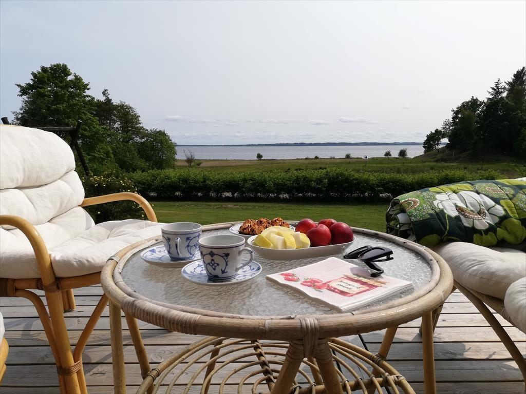 Sommerhusets terrasse og have indbyder til lange, dovne feriedage under åben himmel. Her kan du starte morgenen med morgenkaffen i solen, mens du nyder fjordudsigten og den friske luft, eller slutte dagen med et godt måltid, når solen langsomt går ned over vandet. Terrassen giver rig mulighed for både afslapning og samvær, og haven er et dejligt sted at lade børnene lege, mens de voksne læner sig tilbage og nyder feriestemningen. Uanset om du foretrækker solrige eftermiddage med en bog i hånden eller hyggelige aftener med snak og latter, danner uderummet en naturlig forlængelse af sommerhuset. Fjorden ligger så tæt på, at udsigten næsten bliver en del af terrassen, og det giver en helt særlig fornemmelse af nærhed til naturen.