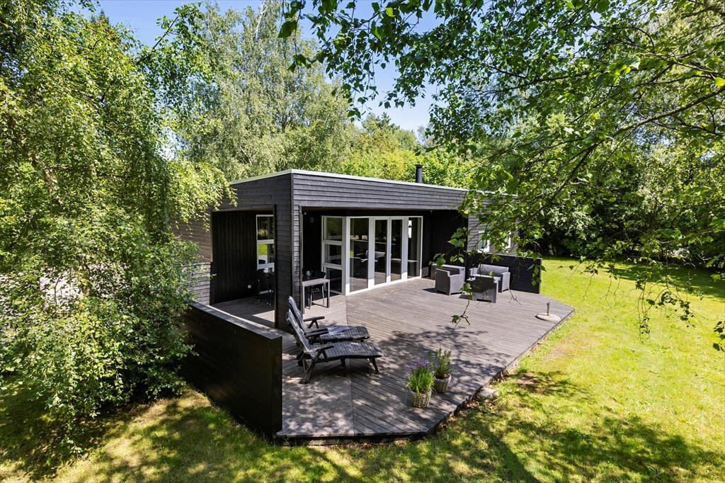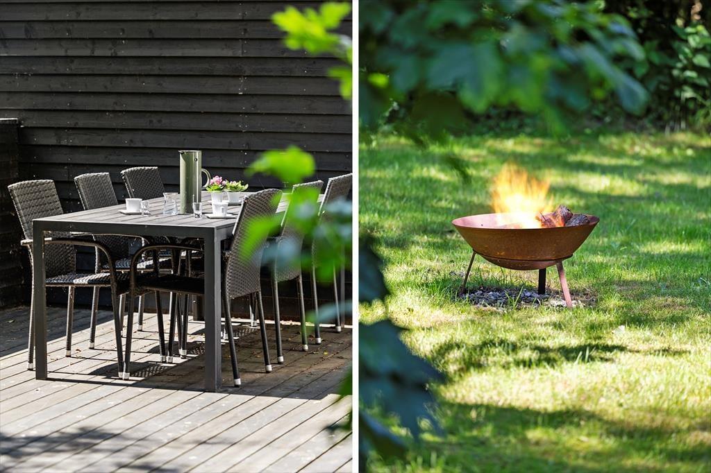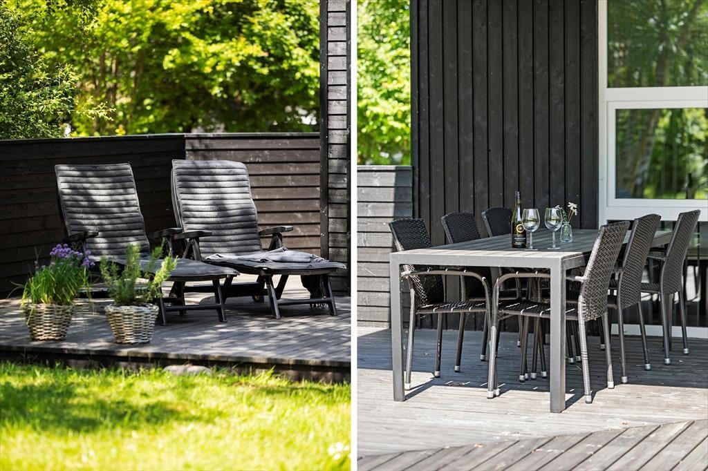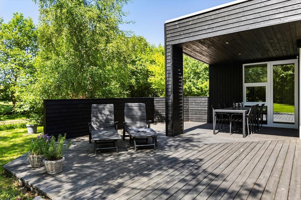 Fra stuen, køkkenet og det ene af soveværelserne har I direkte adgang til sommerhusets terrasser, så det er nemt at komme ud i det fri, når solen skinner. En åben terrasse vender mod øst, mens en anden, delvist overdækket er orienteret mod sydvest, og til sammen måler de 80 m2. Kort sagt er der masser af plads til at slænge sig og nyde driverlivet! I får også fine forhold til at lege og spille boldspil på den 1.285 m2 store grund, der er omgivet af skov og flotte birketræer.