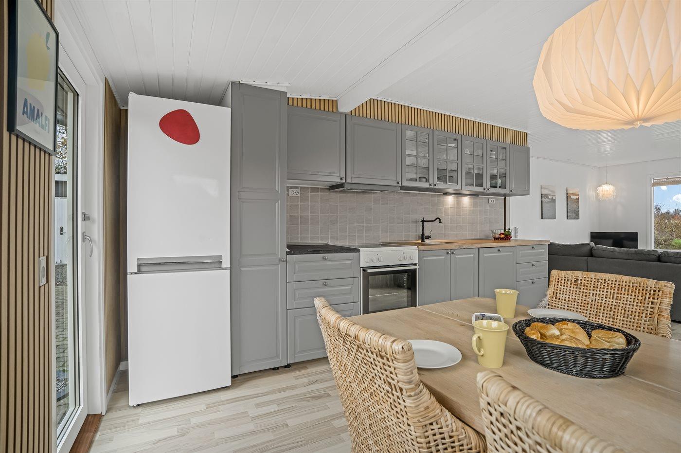 Køkkenet er udstyret med 1 køleskab. Der er 4 elkogeplader, varmluftovn, mikrobølgeovn samt opvaskemaskine.