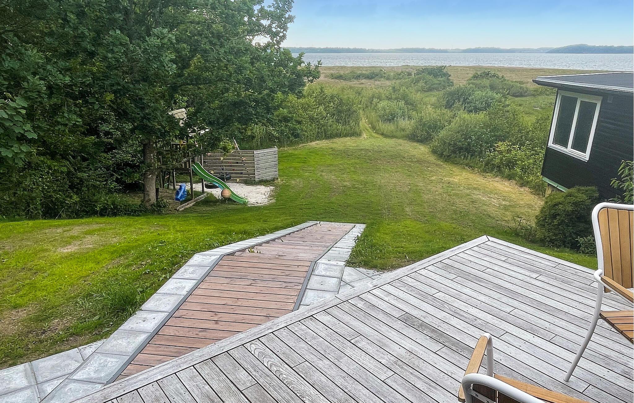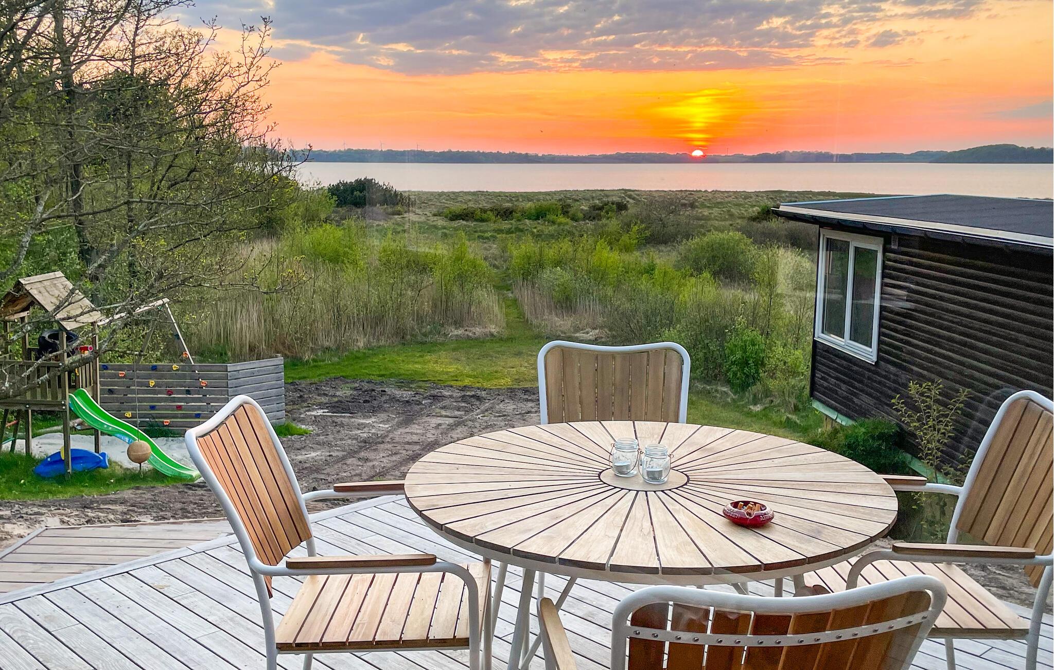 Terrassen løber om flere sider af huset, så I kan finde sol, skygge og læ efter behov i løbet af dagen. Fra terrassen har I en fantastisk udsigt helt ud til spidsen af Lundø. Læs en god bog, indsnus den friske luft og tilbered saftige bøffer på grillen under aftensolen. Måske I skal forkæle jer selv med en tur i det udendørs spabad under stjernerne?