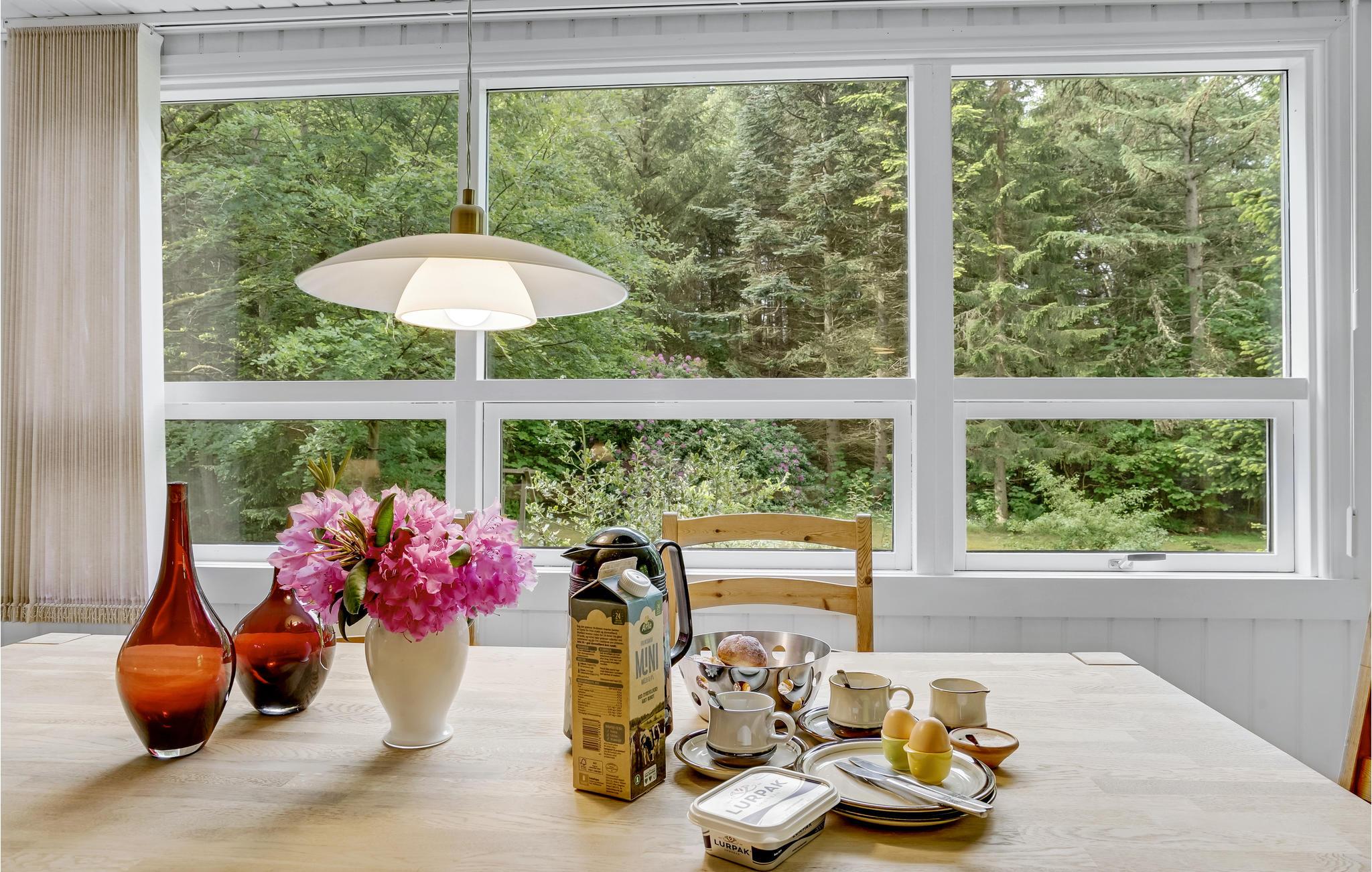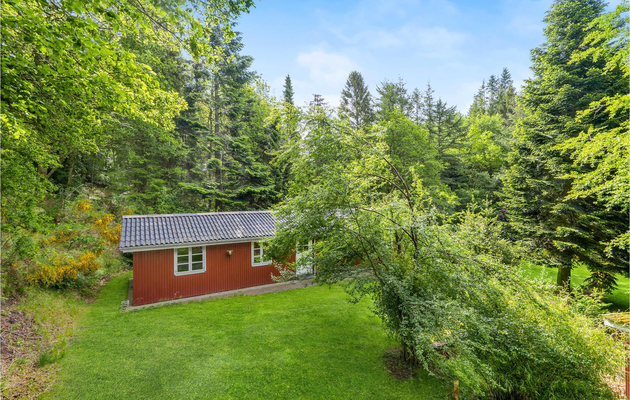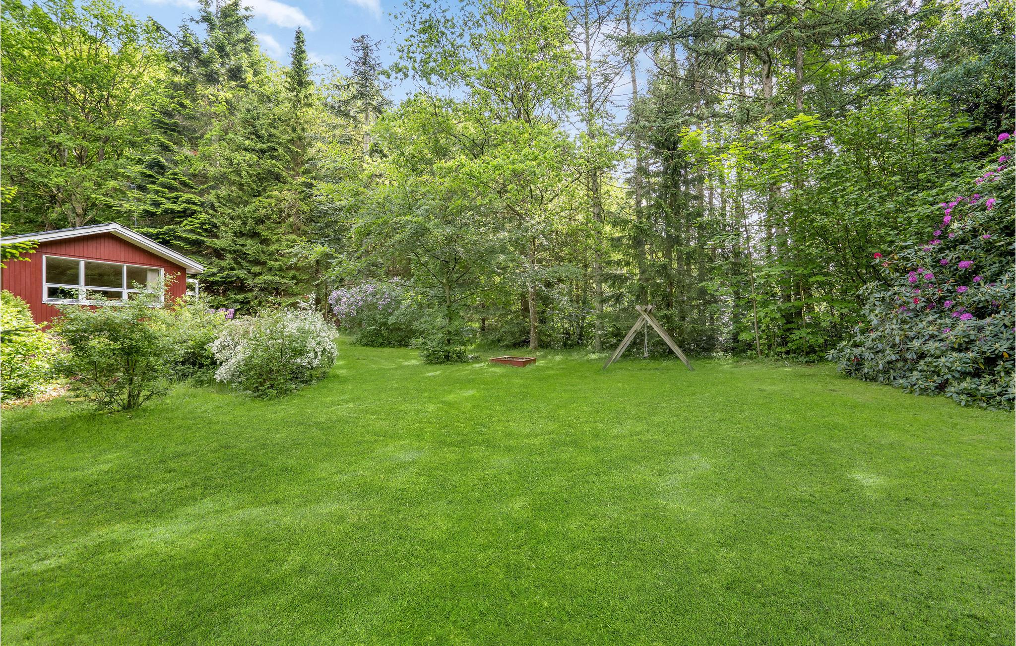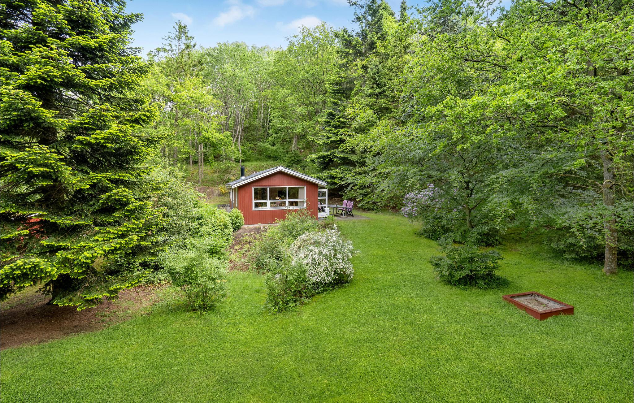 Det rødmalede hus er hyggeligt og enkelt indrettet med plads til seks personer og familiens hund. Den rare atmosfære forstærkes af en brændeovn, træpaneler og de store vinduespartier, som lukker masser af lys ind. Året rundt er haven en fornøjelse, men særligt i sommerhalvåret, hvor træerne bliver tætte af blade og omkranser grunden, så den kommer til at fremstå som jeres egen lille park.