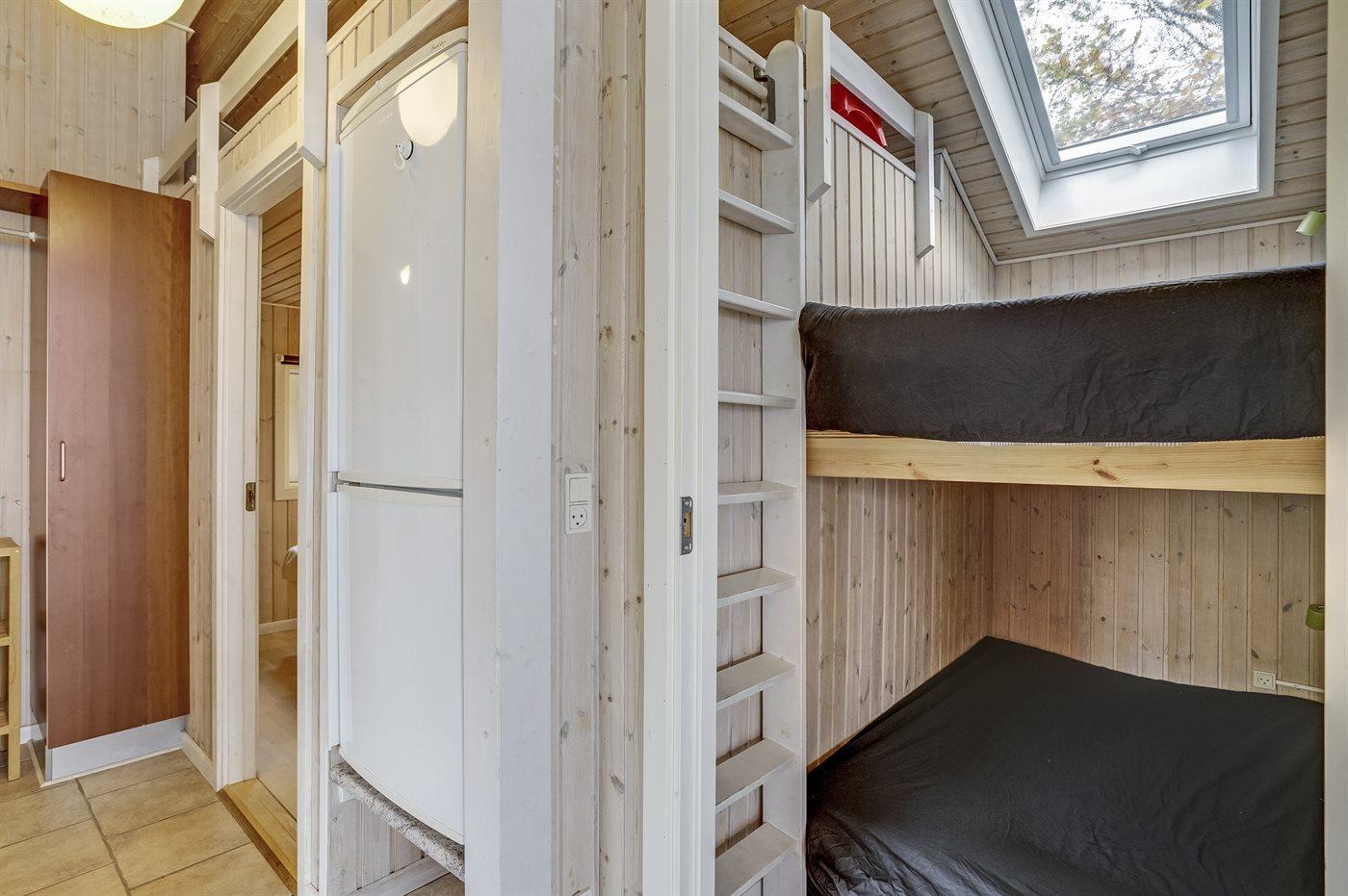 Der er i alt 2 soveværelser. Sovepladserne fordeler sig på: 2 sovepladser i dobbeltseng. 2 sovepladser i køjeseng. 2 sovepladser i sovesofa (dobbelt). 1 soveplads på madras. 2 af disse sovepladser befinder sig på husets hems.