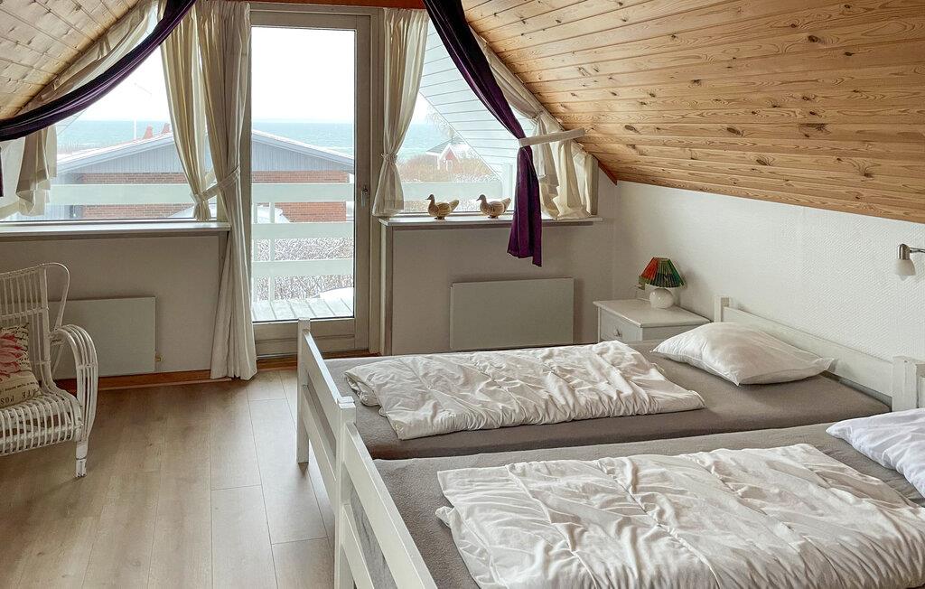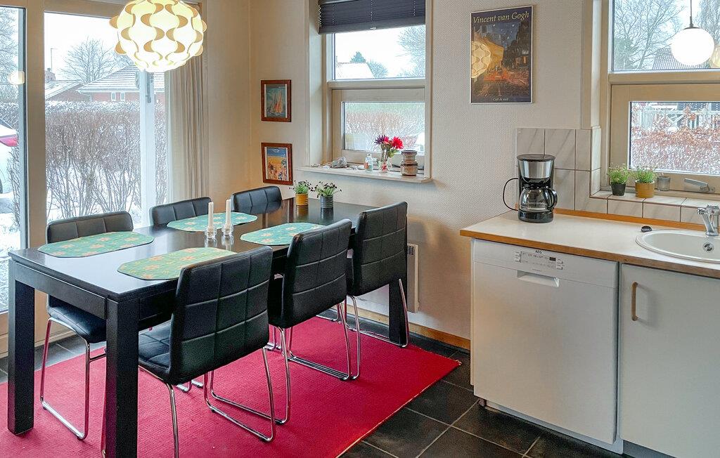Kun nogle få skridt fra vandet kan I nyde en blanding af maritim atmosfære, hyggelig indretning og naturlige omgivelser i dette feriehus. Find jer godt til rette i det hyggelige indre område. Den åbne stue med store vinduespartier byder på masser af naturligt lys og direkte udgang til terrassen. De komfortable sofaer lægger op til at tilbringe afslappende timer, mens brændeovnen giver hyggelig varme på kølige dage. Tag plads ved spisebordet og nyd måltiderne sammen. Husets åbne design betyder, at I altid har en behagelig forbindelse mellem opholds-, spise- og madlavningsområdet.