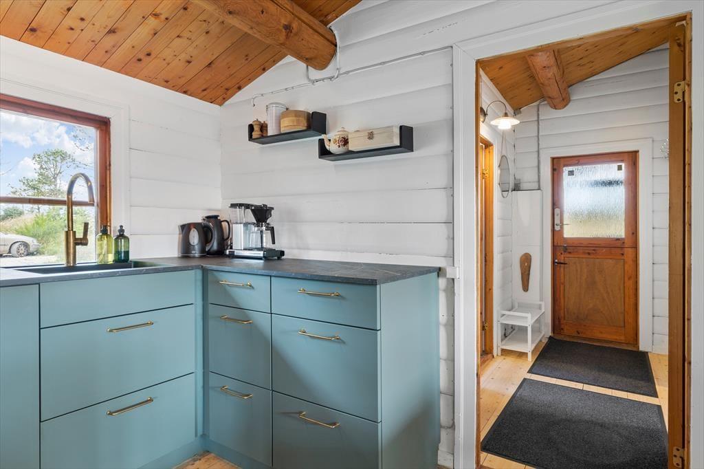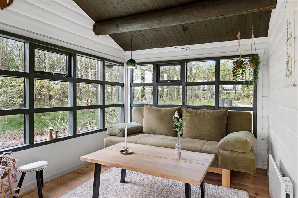Sommerhuset byder dig velkommen med en varm og hyggelig atmosfære. Her er plads til afslapning og fordybelse, mens du mærker roen sænke sig. Med en brændeovn i stuen kan du skabe hygge og varme på de køligere aftener, og den energibesparende varmepumpe sikrer et behageligt indeklima året rundt. Huset har også en dejlig udestue, hvor du kan nyde den smukke udsigt over de naturskønne omgivelser, uanset vejret. Med udgangen fra udestuen direkte til terrassen er det nemt at lade naturen være en del af hverdagen, selv indendørs.