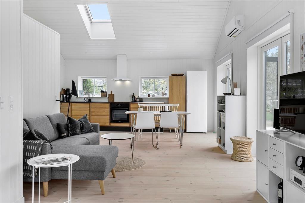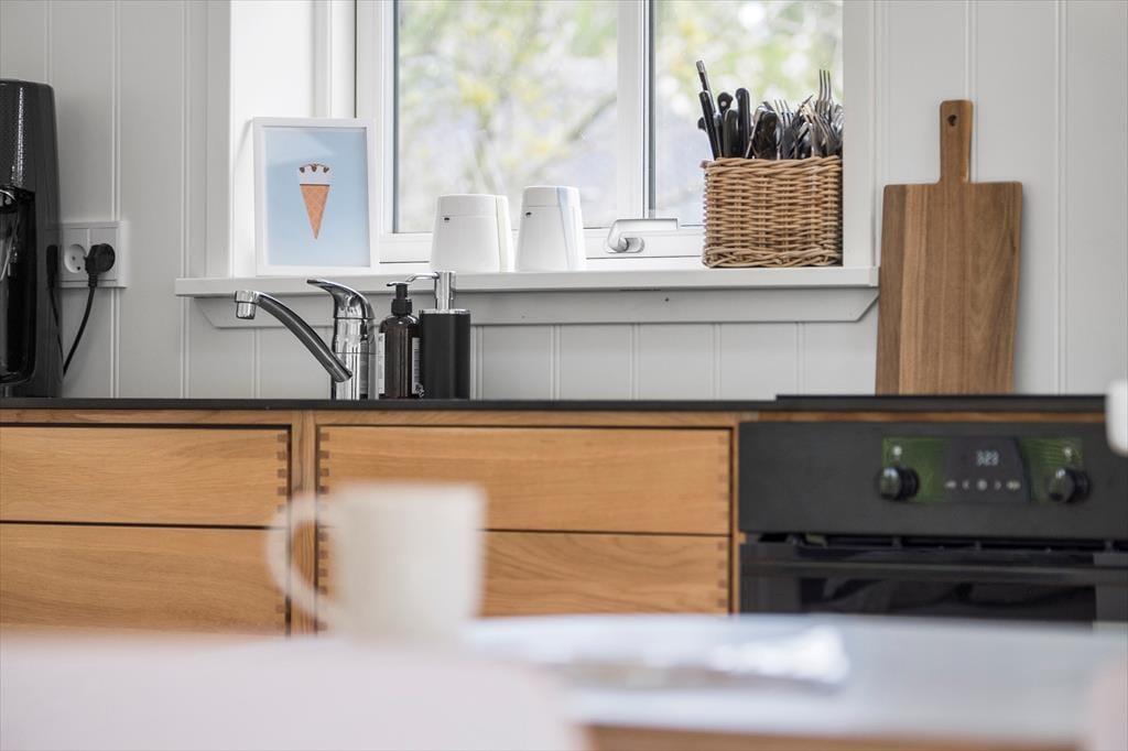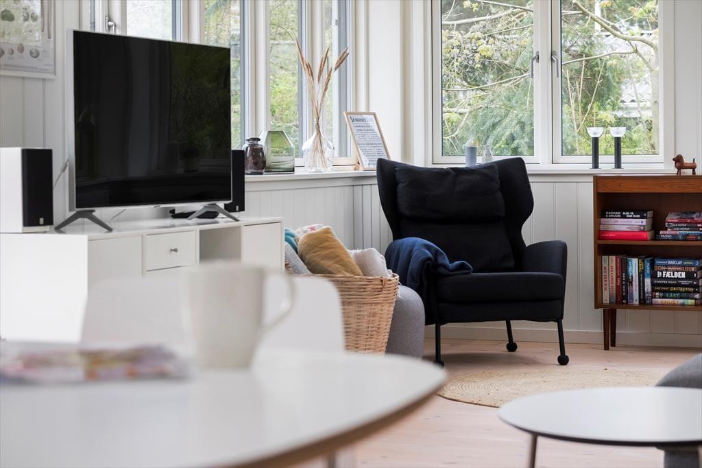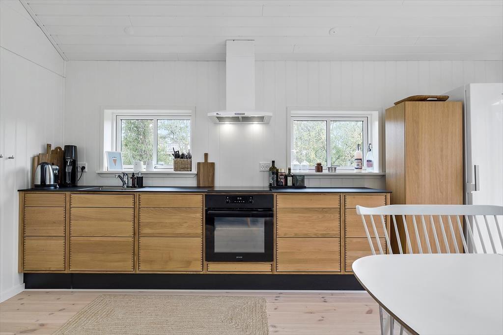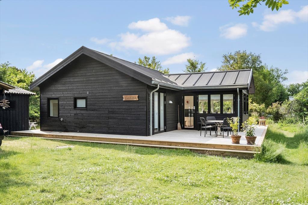 Her på adressen finder I et velbygget sommerhus fra 2021, der præsenterer sig på flotteste vis med sort træfacade og et lyst og skønt indre. De store vinduer inviterer sollyset indenfor fra flere verdenshjørner, og med loft til kip og hvid maling på væggene har stuen et let og luftigt udtryk. Et lækkert køkken er integreret med rummet, så madlavningen bliver en naturlig del af de fælles hyggestunder. Vil I se film, kan I sætte jer godt til rette i sofaen og tænde for fladskærms-tv’et, der har Chromecast tilsluttet. Badeværelset er enkelt, pænt og derudover med bruseniche, og de to soveværelser har i alt tre sengepladser. Hvis I har brug for en ekstra, er der mulighed for at rede op i stuen.