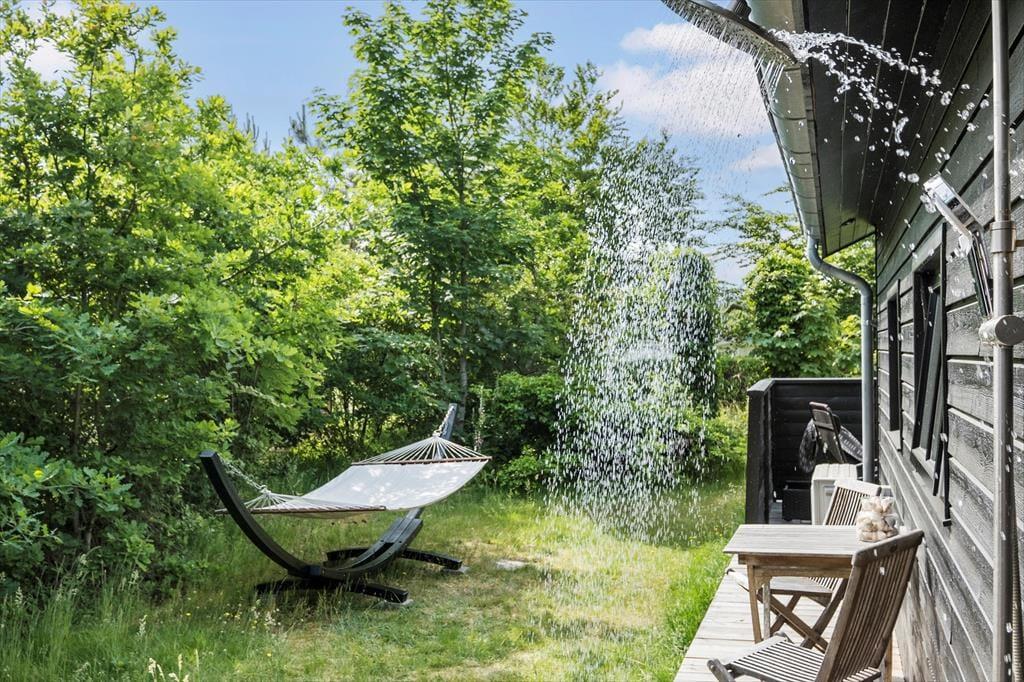 Fra det største soveværelse og stuen har I direkte adgang til den lækre træterrasse, der breder sig rundt om huset. Det betyder, at der er flere gode opholdspladser at vælge imellem – og hvis I trænger til at skylle salt og sandvand af kroppen, når I vender hjem fra strandturen, er der tilmed en udendørs bruser. Til bilen er der carport.