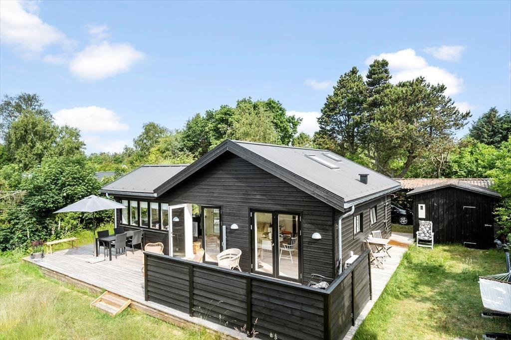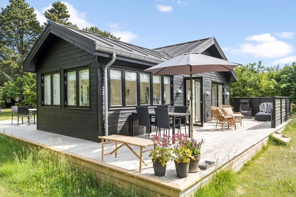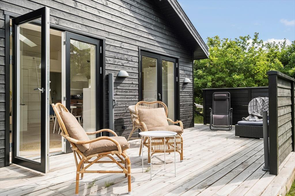 I får en skøn ramme om ferien, når I tilbringer dagene i dette moderne træsommerhus, der ligger på den lille Rovej bare 150 meter fra Lyngså Strand.