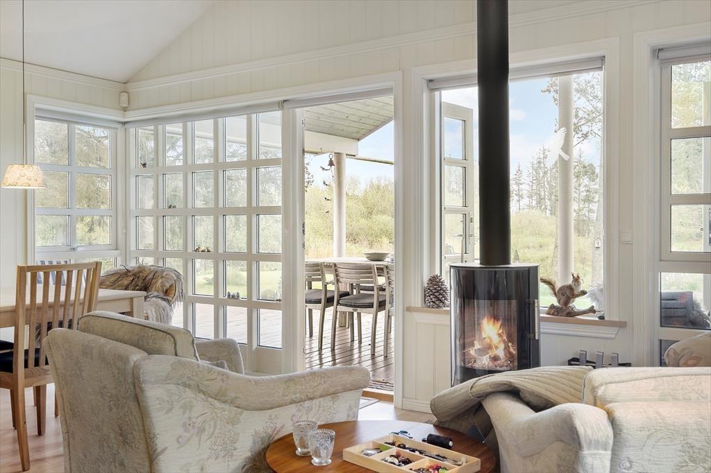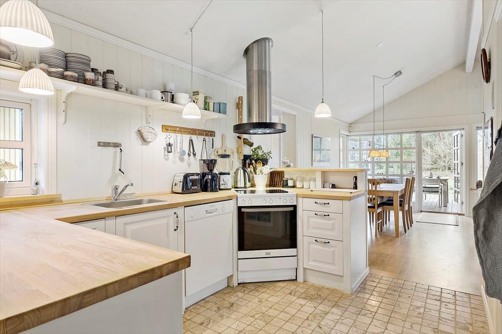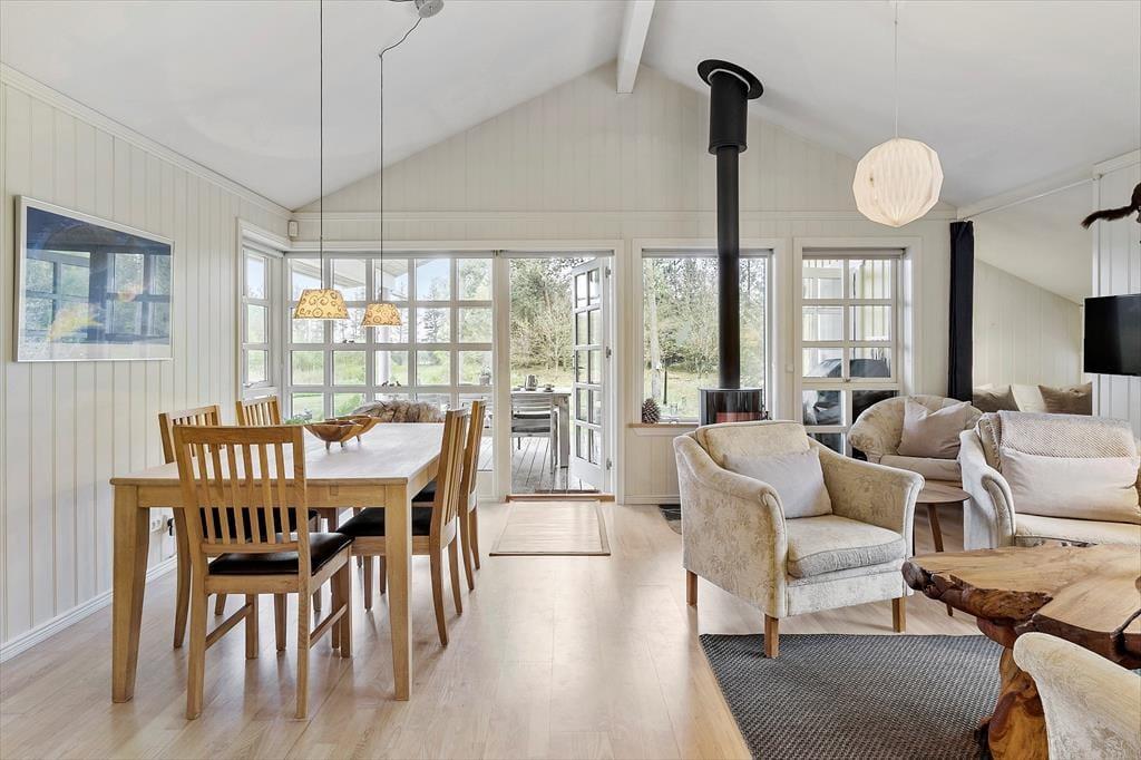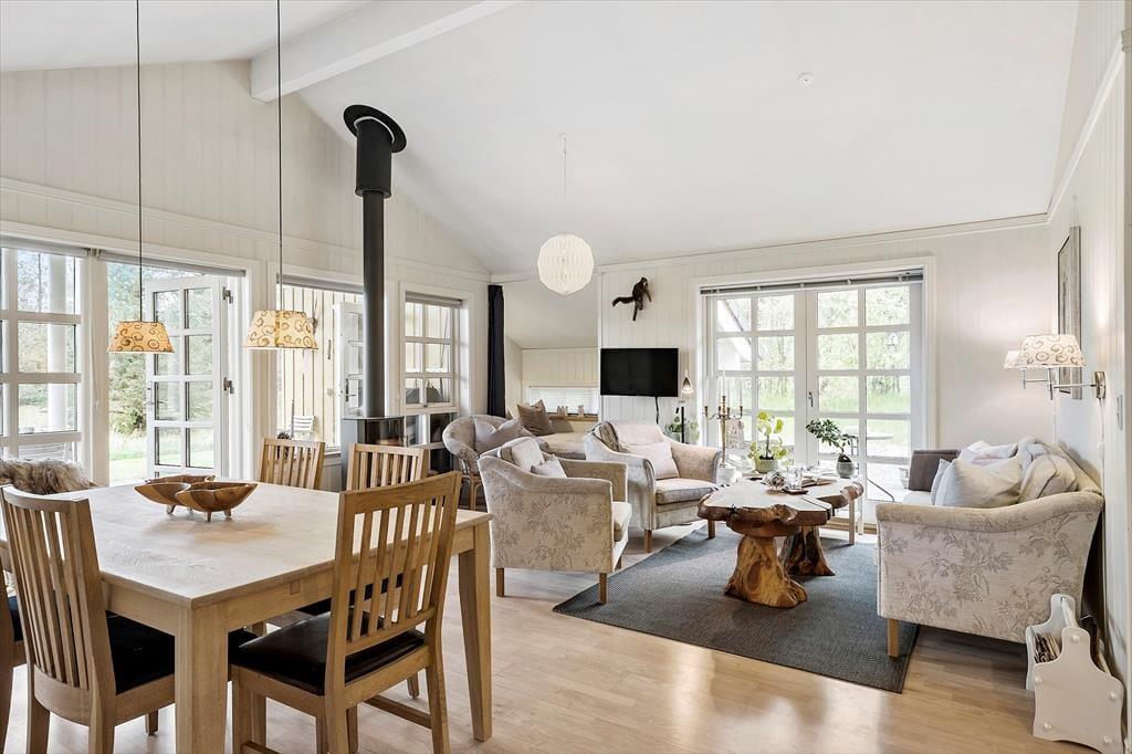 Når du træder indenfor i dette hyggelige sommerhus, bliver du mødt af en indretning, der oser af charme og afslapning. De landlige detaljer, såsom trælofter og klassiske møbler, skaber en varm og indbydende atmosfære. Sommerhuset har flere komfortable siddepladser, hvor du kan slå dig ned med en god bog eller nyde en kop kaffe. Brændeovnen i stuen bidrager til den hyggelige stemning og er perfekt til kølige aftener. Med et åbent køkken, der har alt hvad du behøver for at tilberede lækre måltider, og en rummelig spiseplads, er der god mulighed for at samle familien til fælles madlavning og hyggelige middage. Soveværelserne er komfortable og indbydende, så du kan få en god nats søvn efter en dag fyldt med oplevelser.