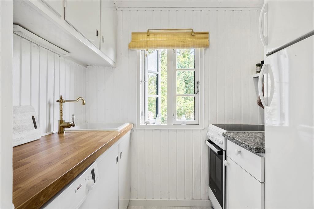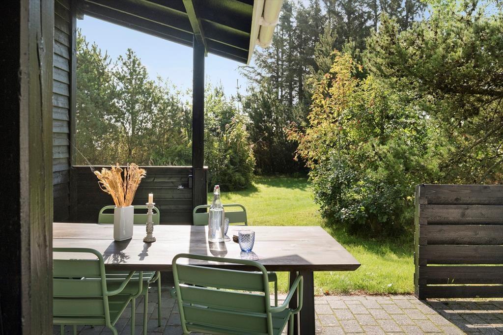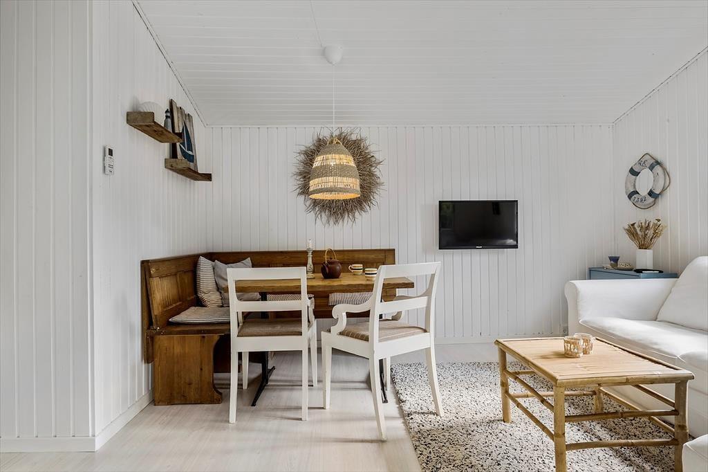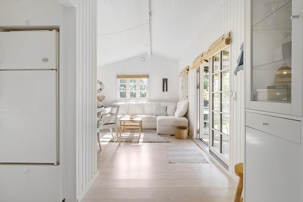 Dette sommerhus byder dig indenfor med en helt særlig charme og hyggelig atmosfære. Indretningen er lys og indbydende med et åbent opholdsrum, hvor du kan samles med dine nærmeste. De store vinduer giver et smukt lysindfald og skaber en tæt forbindelse mellem ude og inde. Med komfortable møbler og et rummeligt spiseområde er der lagt op til lange, afslappede måltider og hyggelige stunder, hvor du kan nyde nærværet og feriestemningen. Uanset om du vil læse en god bog, se en film eller bare slappe af, så skaber dette sommerhus den perfekte ramme om en ferie i ro og mag.