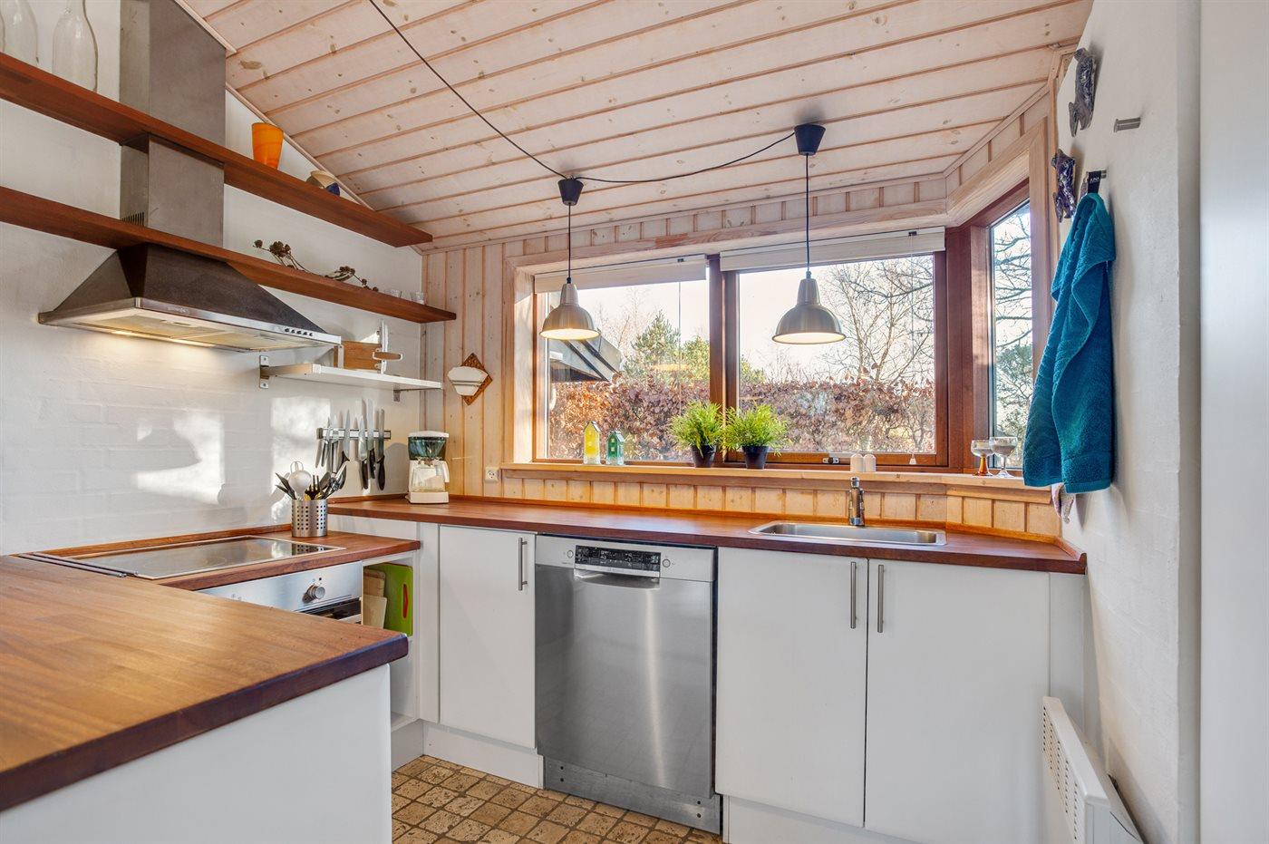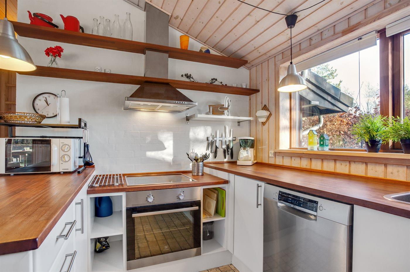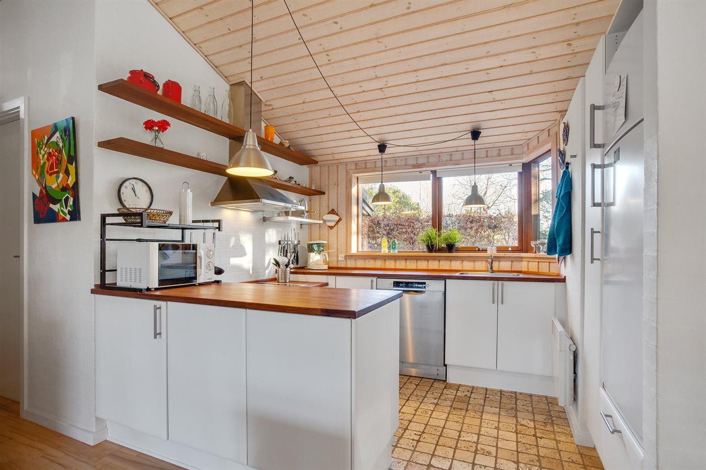 Køkkenet er udstyret med 1 køleskab. Der er 4 keramiske kogeplader, varmluftovn, mikrobølgeovn samt opvaskemaskine Der er gulvvarme i køkkenet.