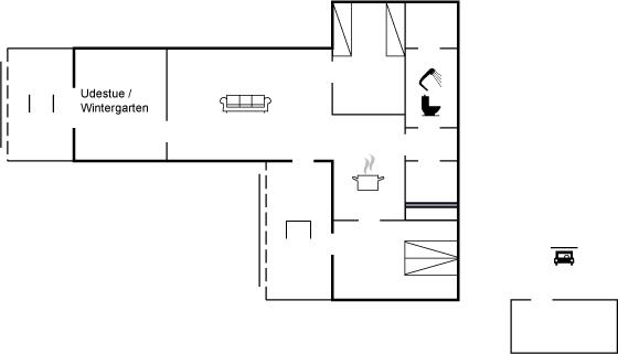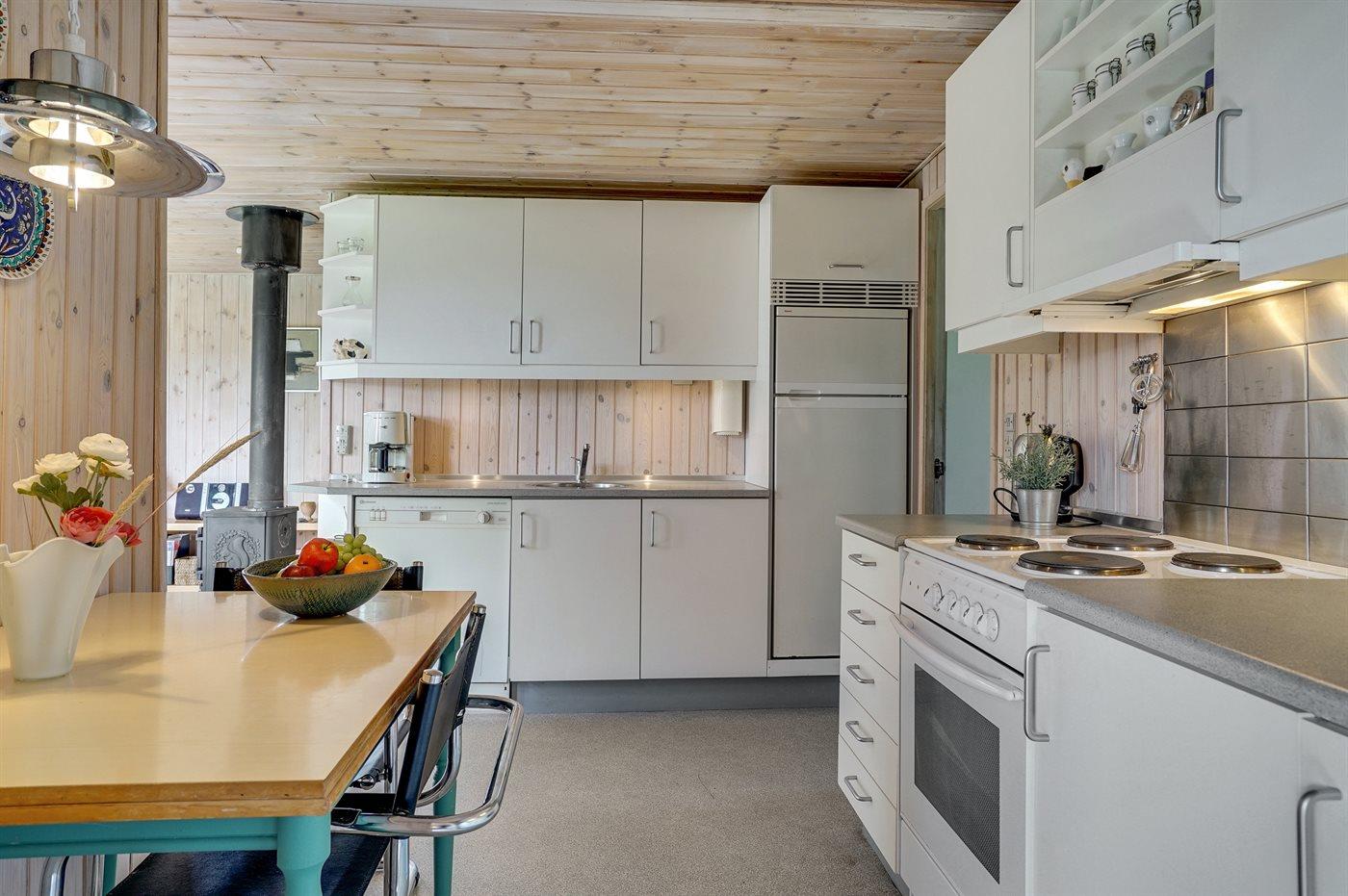 Køkkenet er udstyret med 1 køleskab. Der er 4 elkogeplader, varmluftovn, mikrobølgeovn samt opvaskemaskine.