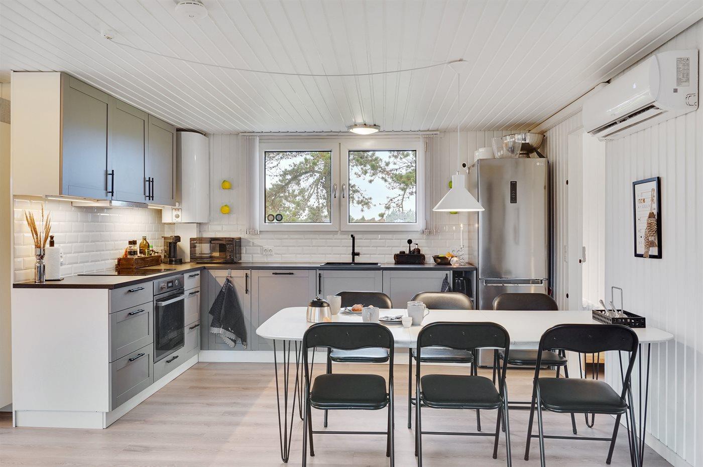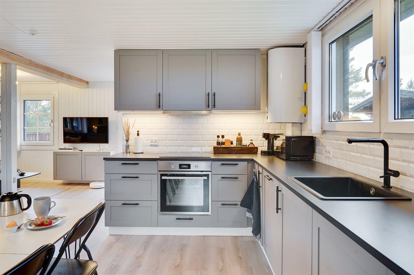 Køkkenet er udstyret med 1 køleskab. Der er 4 induktionskogeplader, varmluftovn, mikrobølgeovn samt opvaskemaskine.