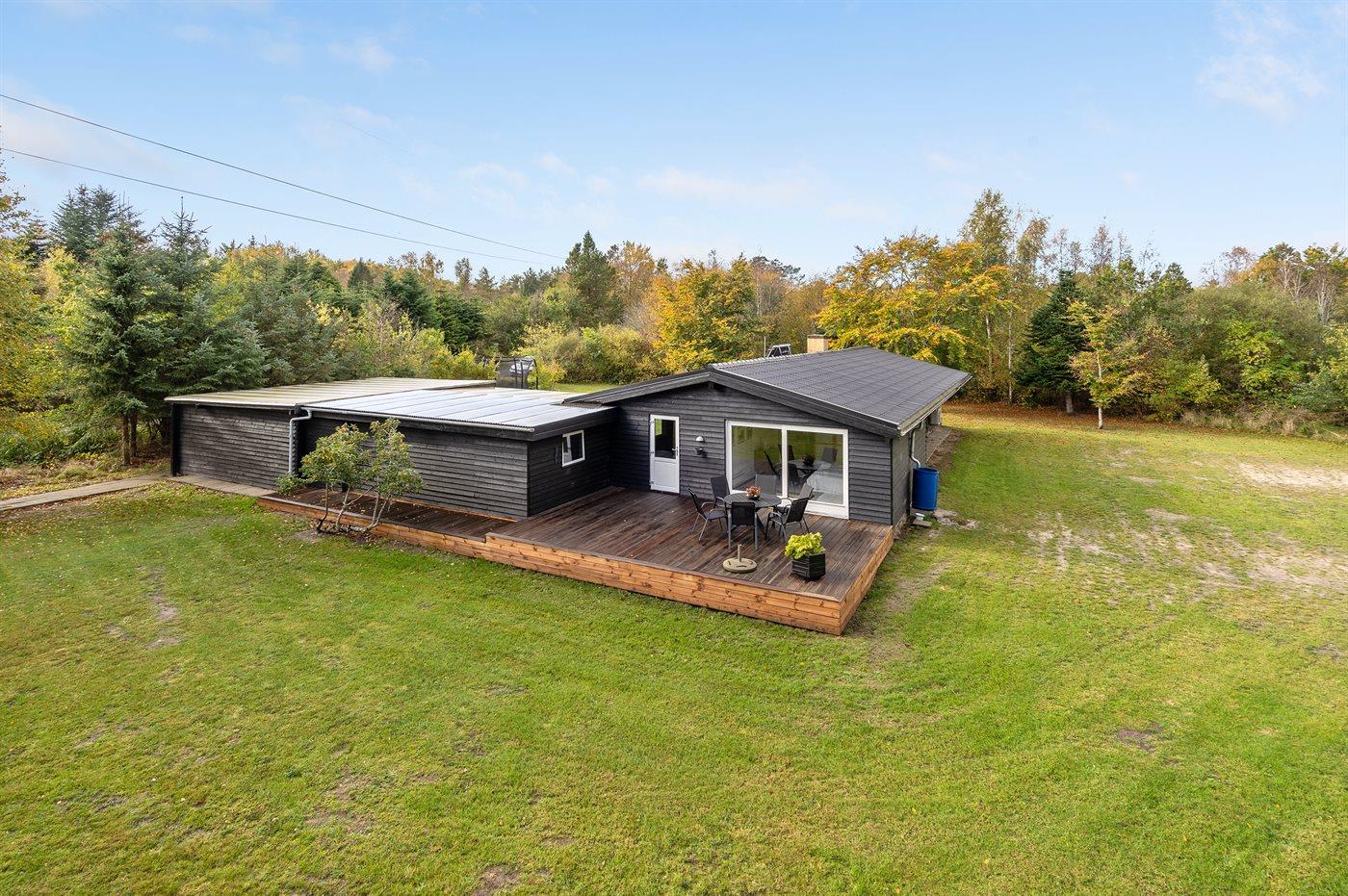 Ferieboligen er beliggende på en 5000 m² stor havegrund. Der er 1100 m til havet. Nærmeste forretning er beliggende i en afstand af 3200 m. Til ferieboligen hører åbent terrasseareal. Desuden er der overdækket terrasse. Trampolin. Grill til rådighed. Der er carport til rådighed. Der er installeret stik til opladning af elbil. Parkering ved ferieboligen.