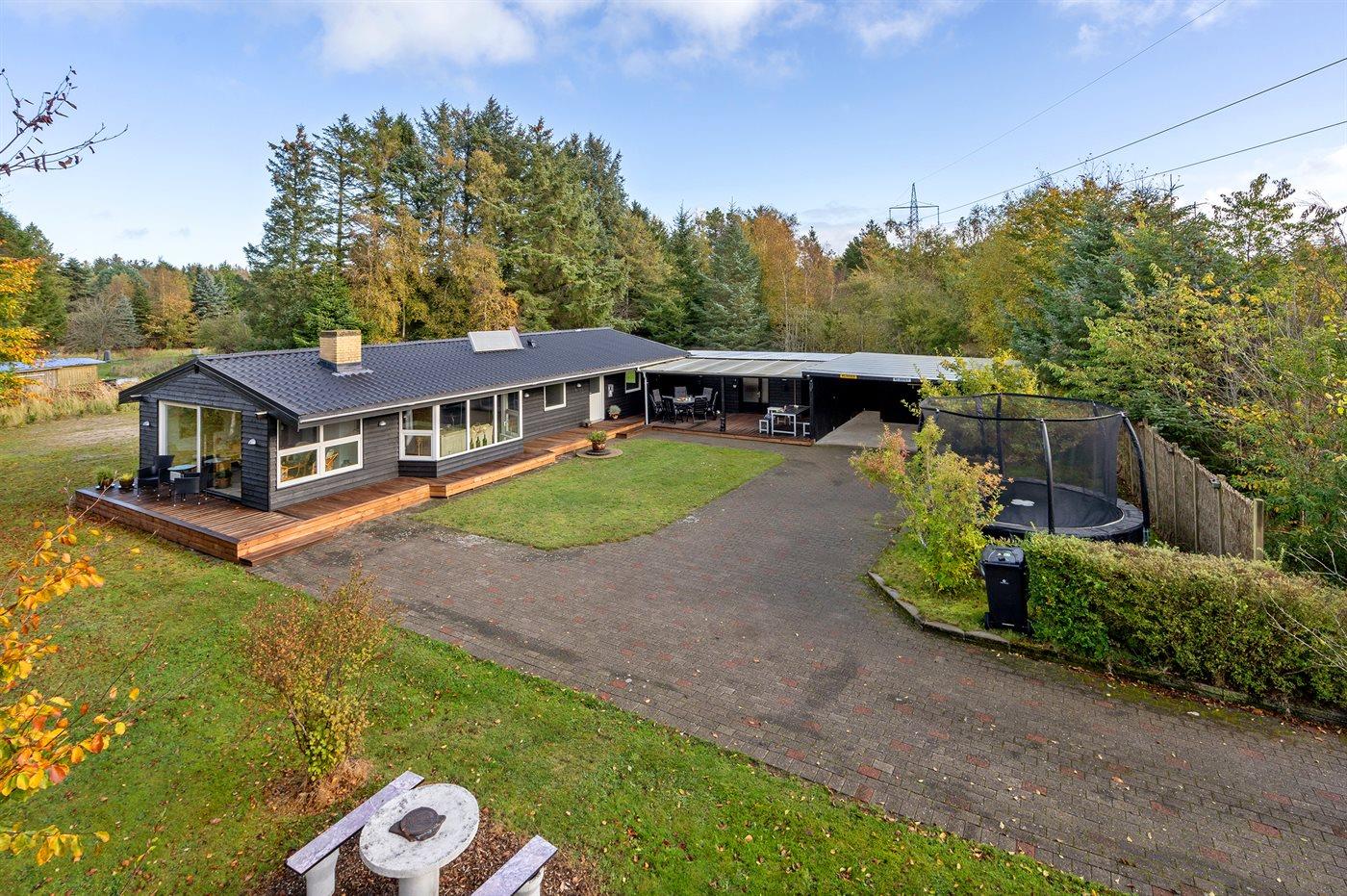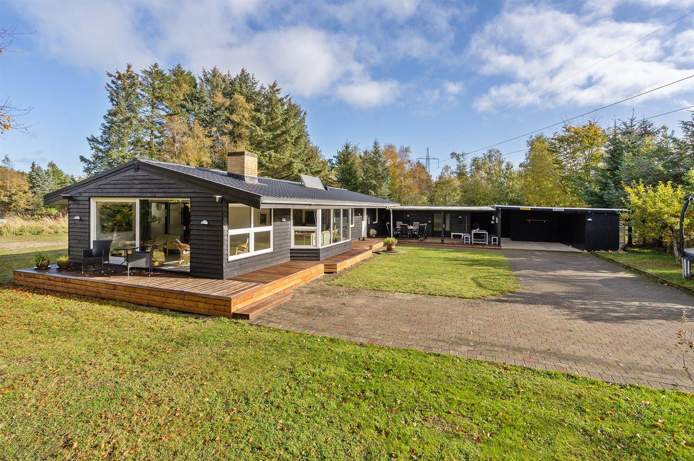 Flot sommerhus i Sæby med store terrasser, skovgrund og moderne faciliteter, perfekt til en afslappende ferie.