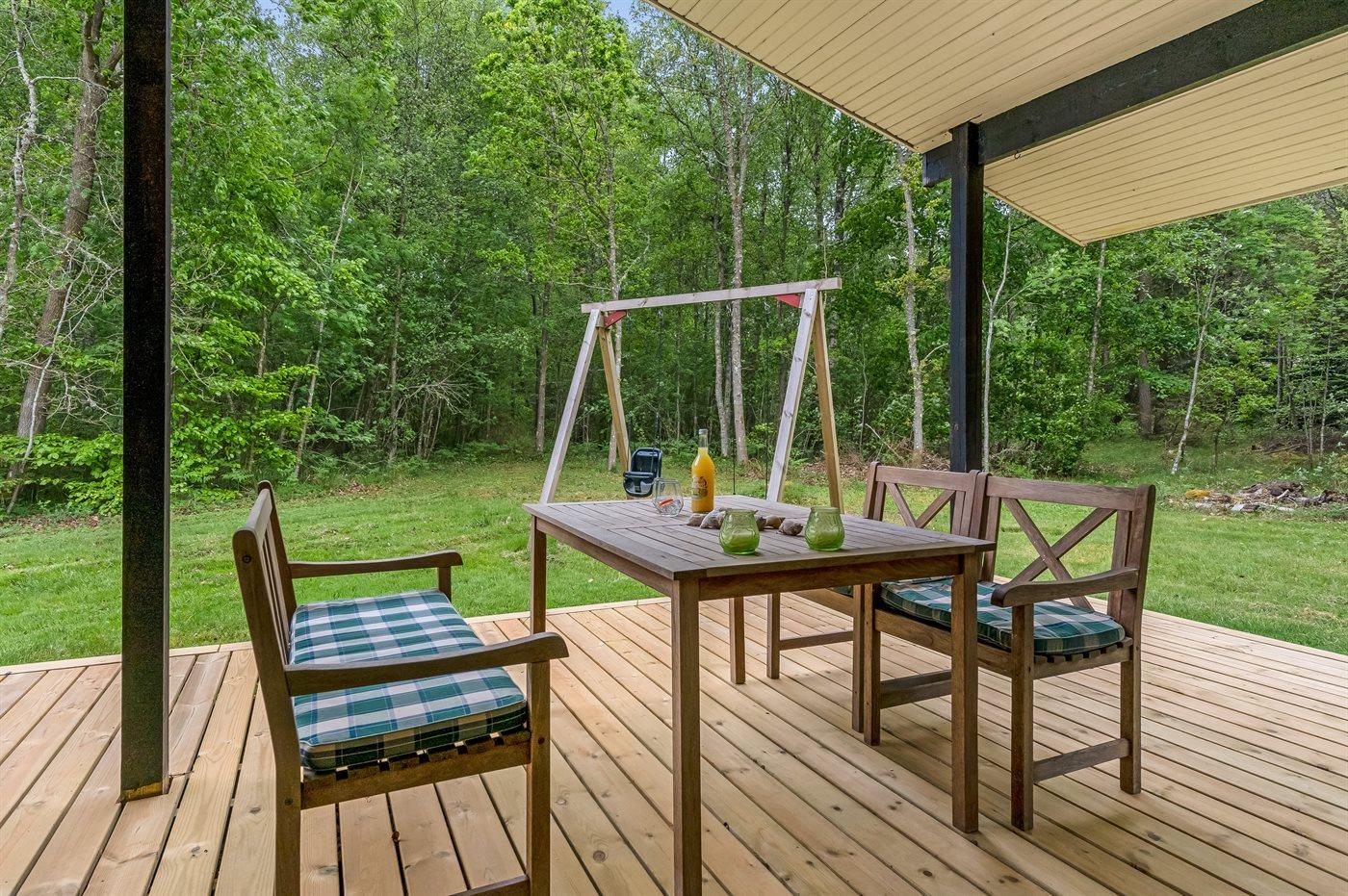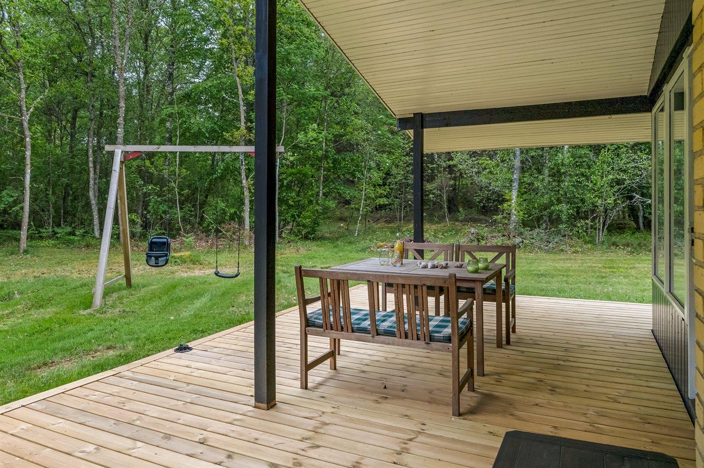 Ferieboligen er beliggende på en 5000 m² stor naturgrund. Der er 1170 m til havet. Nærmeste forretning er beliggende i en afstand af 3100 m. Til ferieboligen hører åbent terrasseareal. Desuden er der overdækket terrasse. Der er redskabsrum. Gynge. 2 gasgrill står til rådighed. Parkering ved ferieboligen.