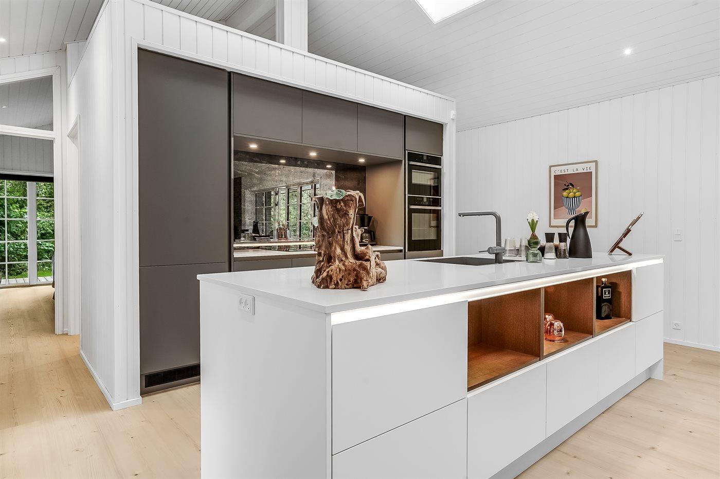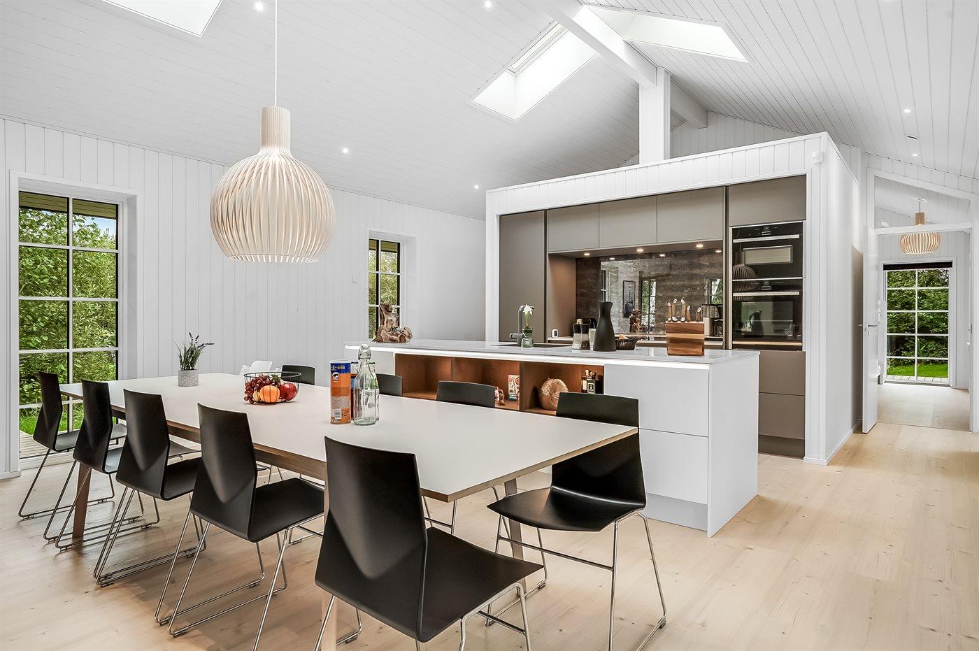 Køkkenet er udstyret med 1 køleskab. Der er 4 induktionskogeplader, varmluftovn, mikrobølgeovn samt opvaskemaskine.