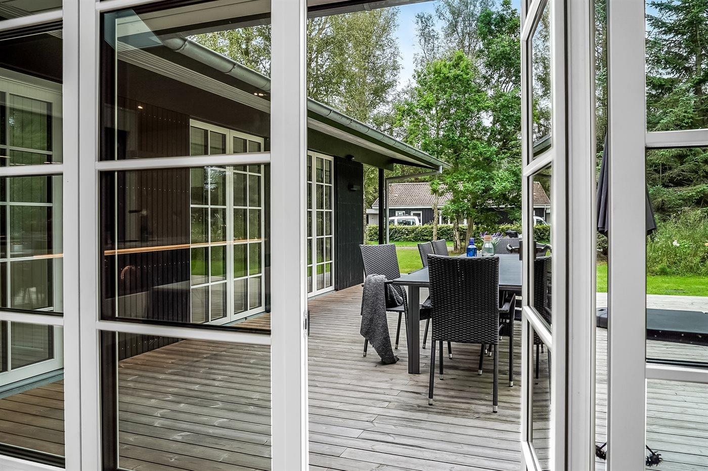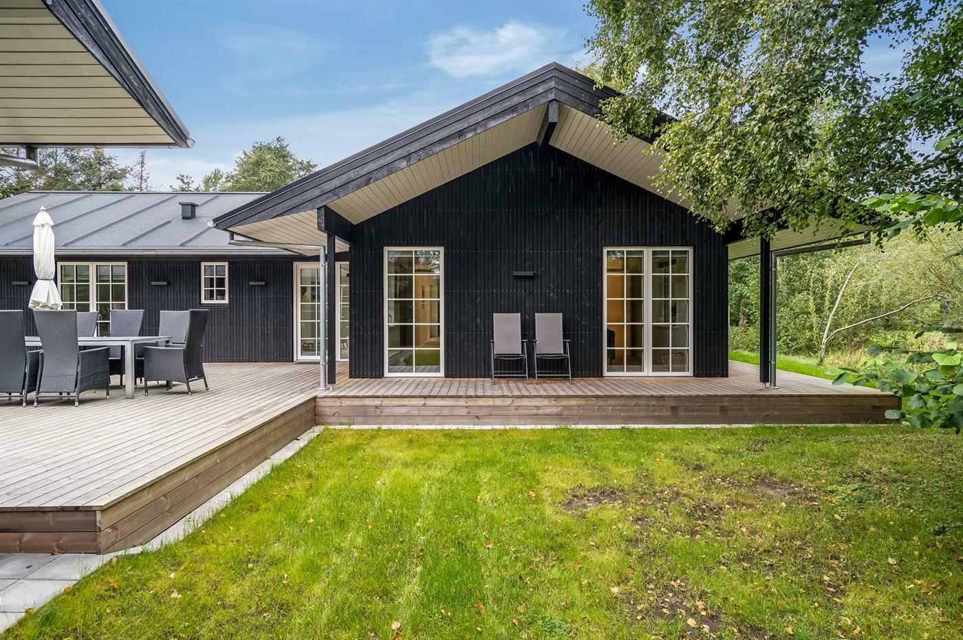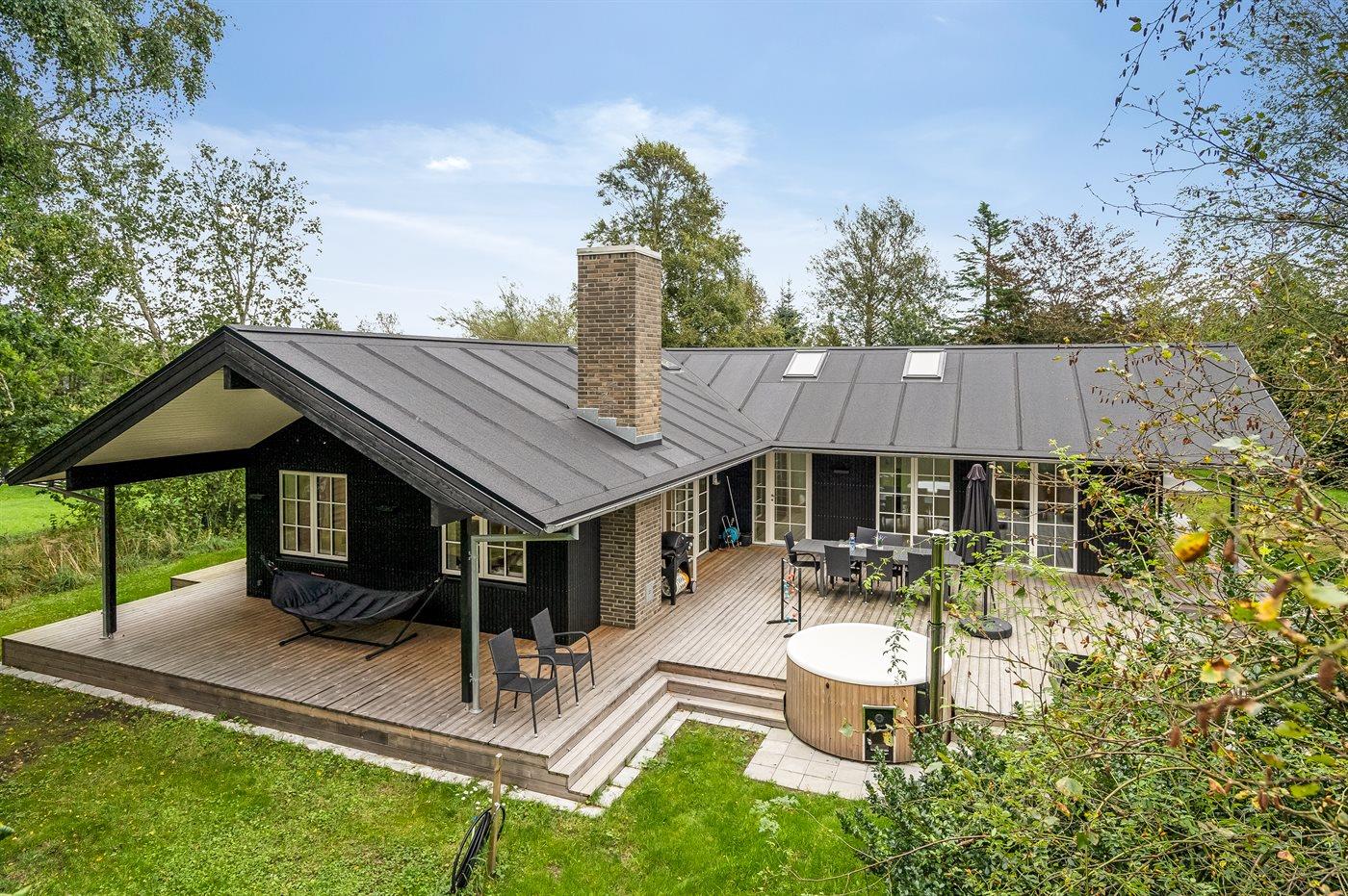 Sommerhuset er opført med materialer af høj kvalitet og har en virkelig god planløsning, som passer til både en familie med flere børn eller sågar to familier - mulighederne er mange i dette dejlige sommerhus. Her findes fantastiske terrassearealer, som også delvist er overdækket, og her er altid mulighed for at finde en lækrog, og tilmed ligger huset helt ugenert. På terrassen står et vildmarksbad, som kan rumme op til 6 personer og er en fornøjelse af benytte året rundt. Ved siden af sommerhuset er opført et stort og indbydende aktivitetsrum, som børn og voksne i alle aldre kan hygge sig med.