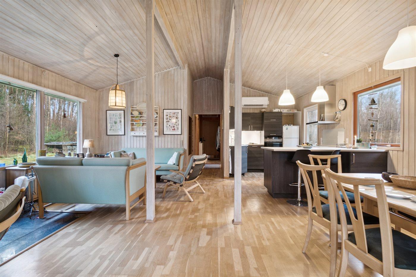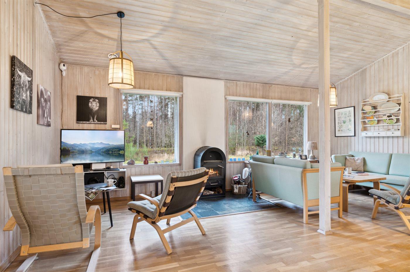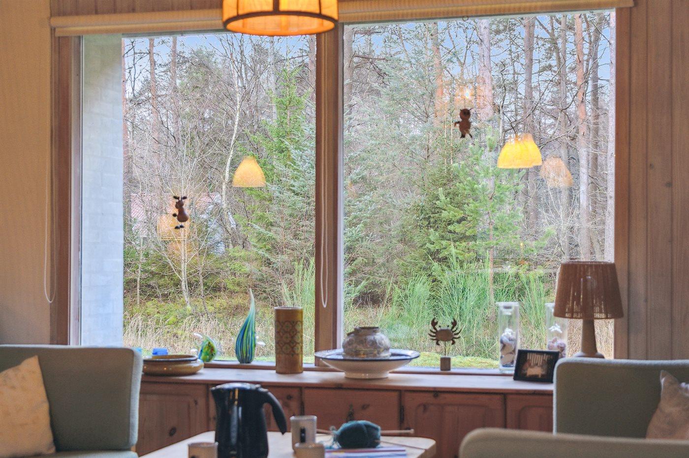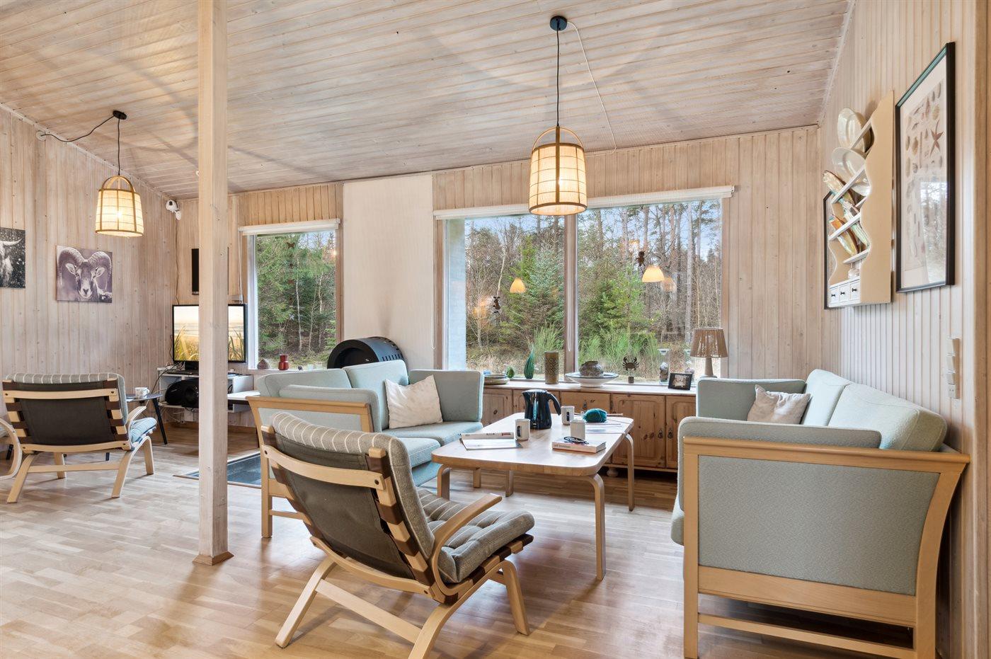 Dette dejlige og hyggelige sommerhus er fantastisk beliggende på en stor naturgrund i fuldstændig ugenerte og fredelige omgivelser. Her er der et rigt dyreliv, og man føler sig virkelig i ét med naturen, hvad enten man er indenfor og udenfor. Grunden indbyder samtidig til boldspil og leg med masser af plads for børn at boltre sig på. Hvis man ønsker at holde en uforstyrret ferie i rolige og naturskønne omgivelser, er dette hus det helt rigtige valg, da hele grunden også er omkranset af høje træer og nærmest ligger i et skov/plantage område. Indenfor ca. 1300 meter ligger havet med den fine sandstrand, hvor familien kan hygge sig i timevis.