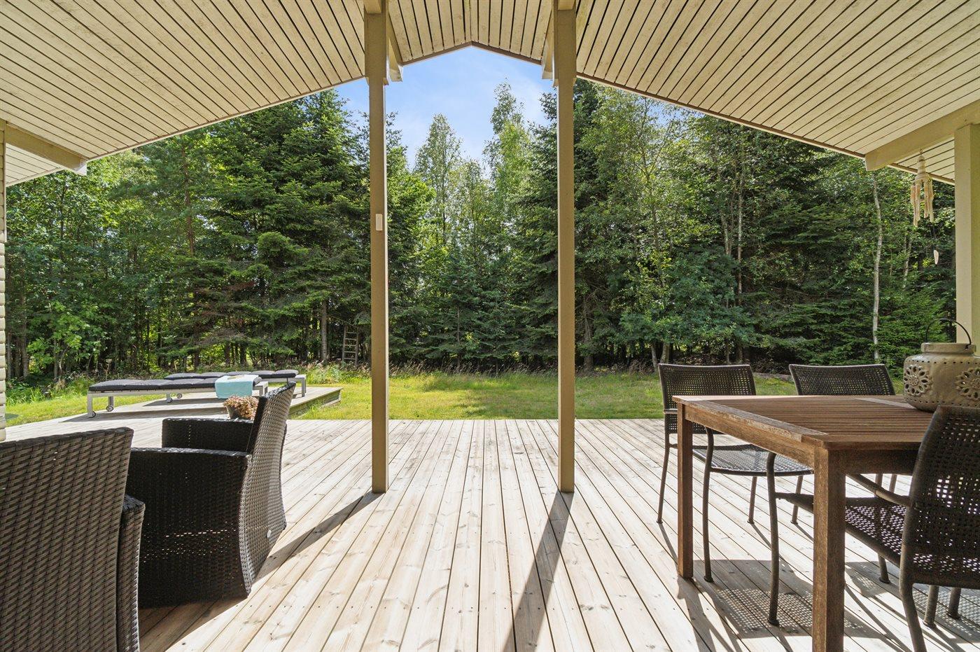 Ferieboligen er beliggende på en 5000 m² stor grund i skov/plantage. Der er 1300 m til havet. Nærmeste forretning er beliggende i en afstand af 6000 m. Der er en golfbane i en afstand af 12000 m. Til ferieboligen hører åbent terrasseareal. Desuden er der overdækket terrasse. Der er redskabsrum. Trampolin. Grill til rådighed. Der er installeret stik til opladning af elbil. Type 2 stik. Parkering ved ferieboligen.