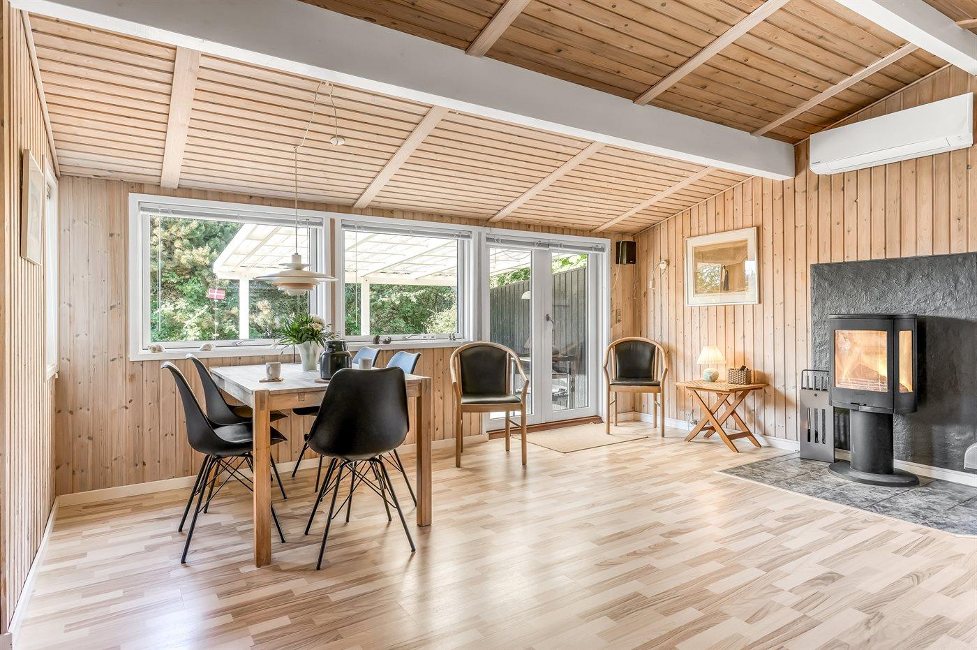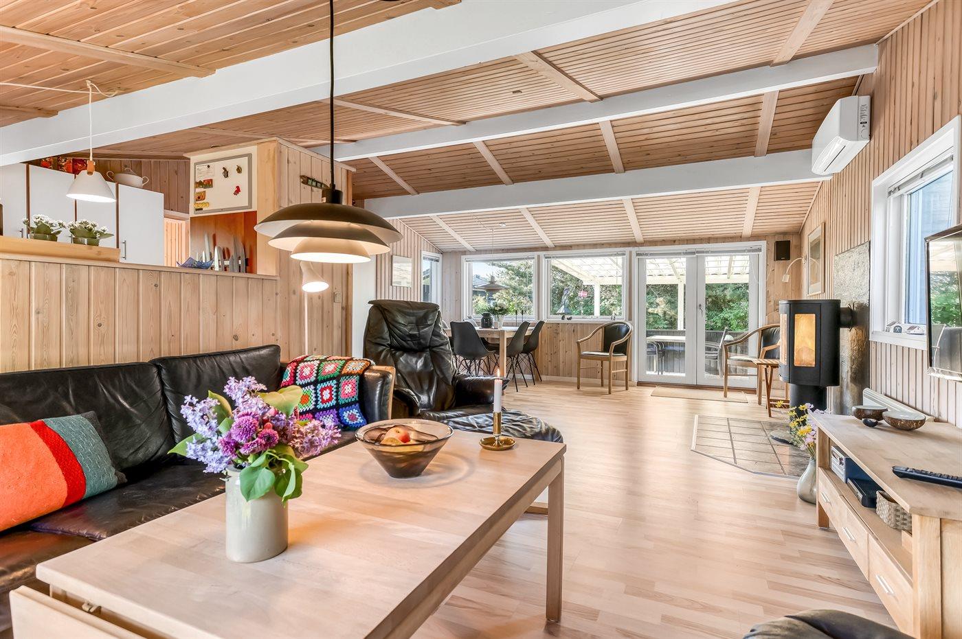Hyggeligt sommerhus nær børnevenlig sandstrand med sauna, brændeovn og opladning til elbil.