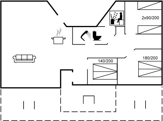 Der er i alt 3 soveværelser. Sovepladserne fordeler sig på: 4 sovepladser i dobbeltsenge. 2 sovepladser i enkeltsenge. Derudover er der 1 stk. barneseng.