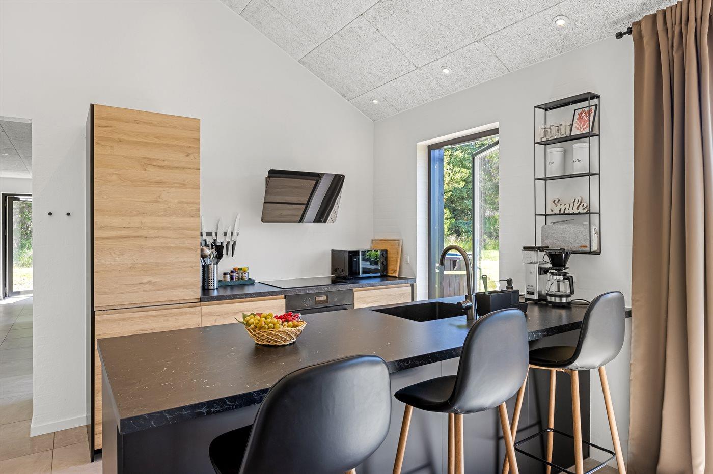 Køkkenet er udstyret med 1 køleskab. Der er 4 induktionskogeplader, varmluftovn, mikrobølgeovn samt opvaskemaskine.
