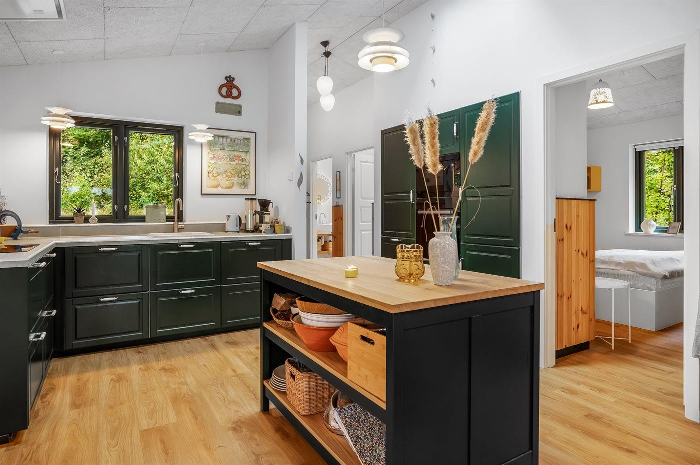 Køkkenet er udstyret med 1 køleskab. Der er 4 induktionskogeplader, varmluftovn, mikrobølgeovn samt opvaskemaskine.