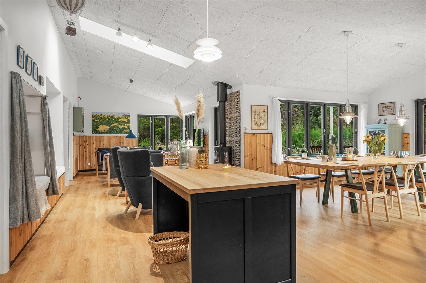 Sommerhuset er indrettet med 3 soveværelser, alle med dobbeltsenge. Stuen byder på en hyggelig atmosfære med en brændeovn, og hele huset har gulvvarme, der opvarmes via en effektivt luft-til-vand varmepumpe. Køkkenet er fuldt udstyret med moderne faciliteter, så der kan tilberedes lækre måltider i ferien.