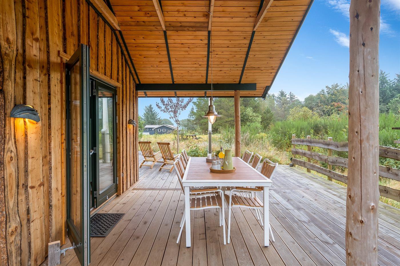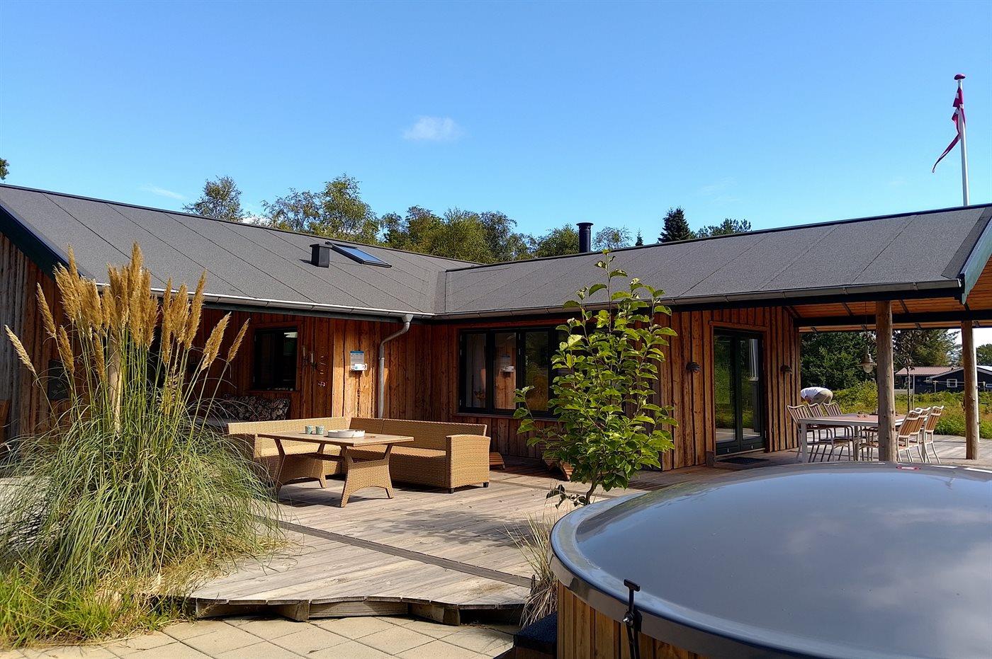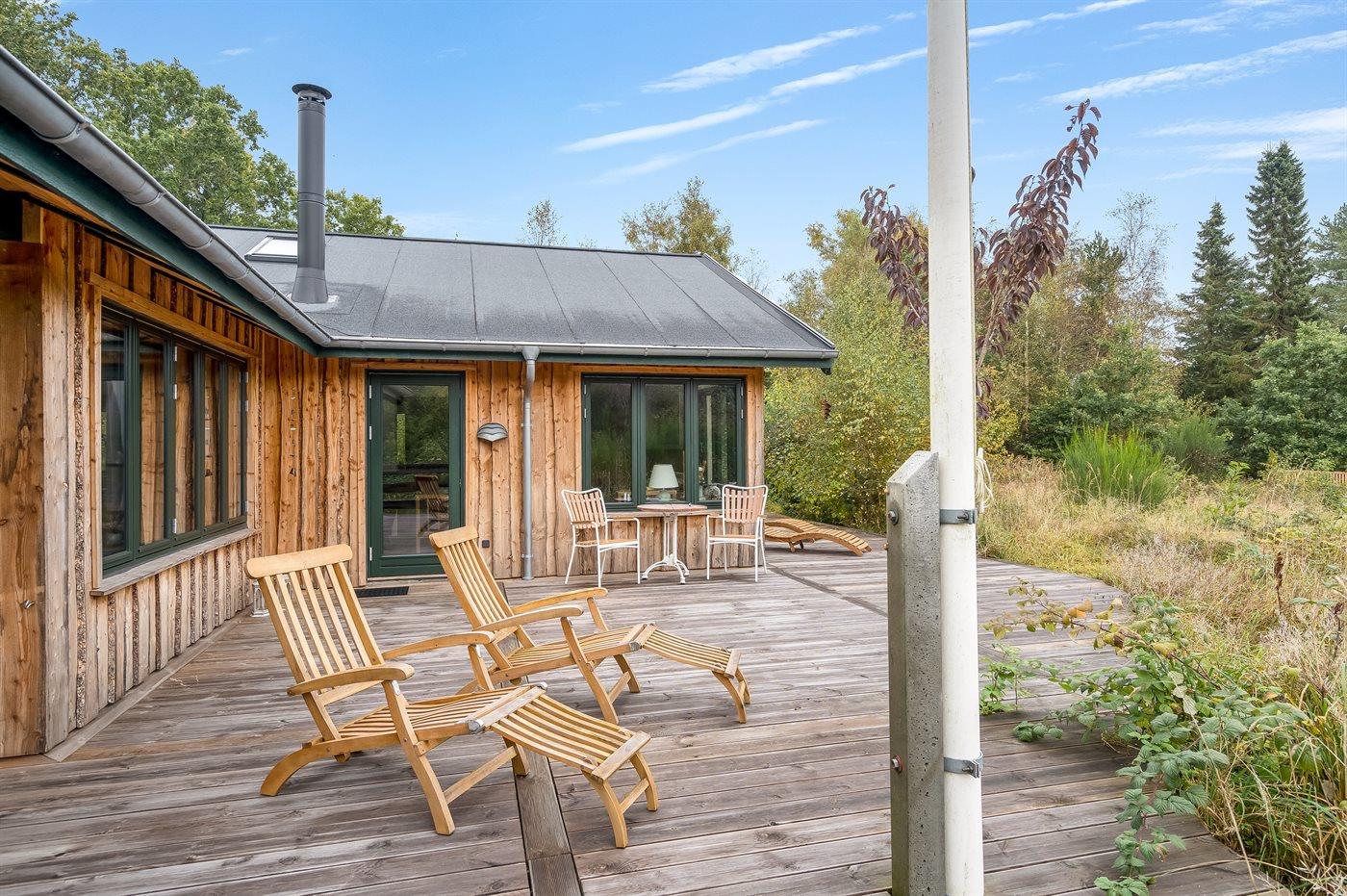 Moderne sommerhus i Lyngså med vildmarkskar, stor terrasse og elbiloplader nær havet.