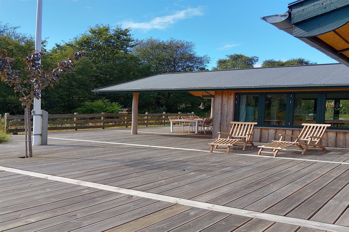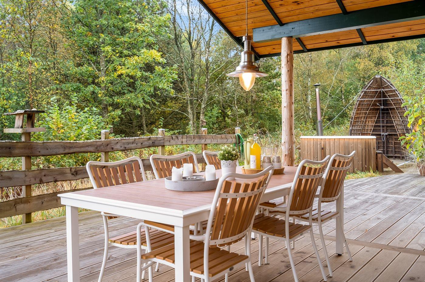Udendørs findes der en imponerende og delvist overdækket terrasse, der går hele vejen rundt om huset. Her findes der solvogne, som er perfekte til afslappende timer og der findes ydermere et vildmarkskar, hvor I kan nyde varme bade under åben himmel.