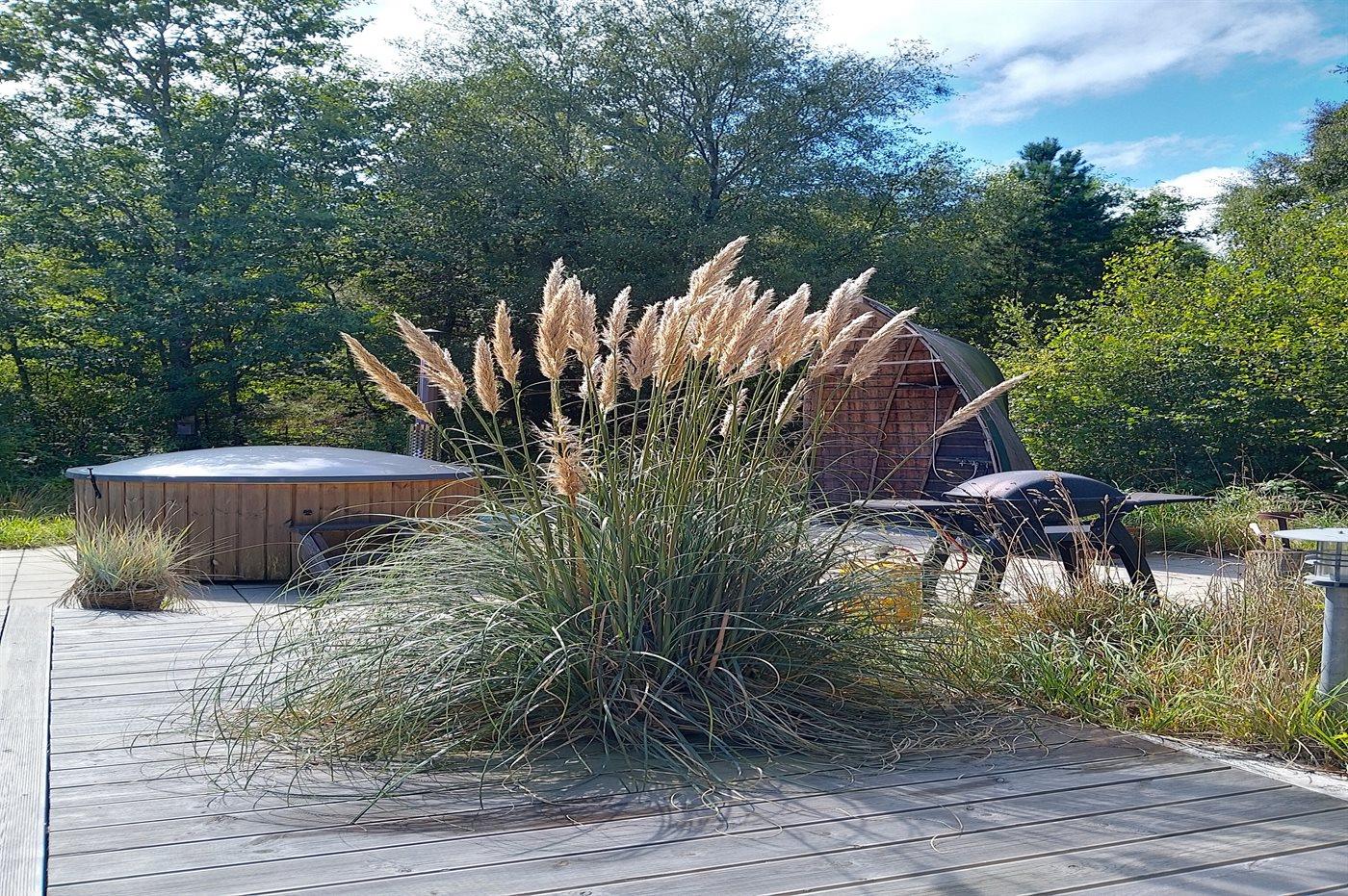 Huset ligger på en naturskøn grund med høje græsser, og rundt omkring på grunden er der opstillet bænke, hvor I kan sidde og nyde roen og naturen omkring jer.