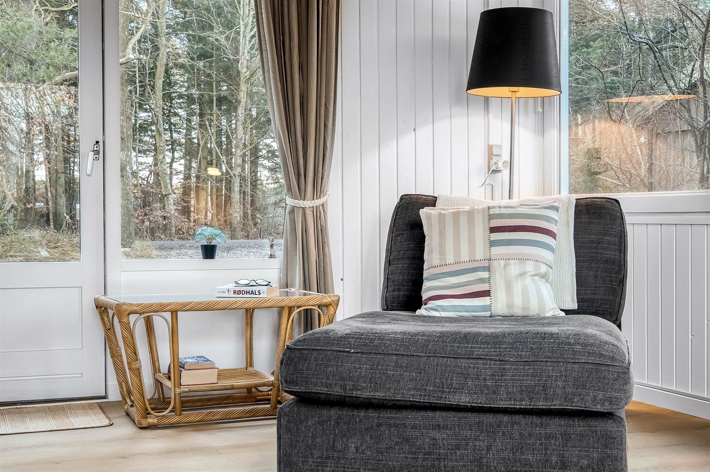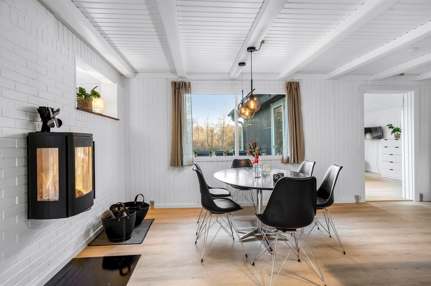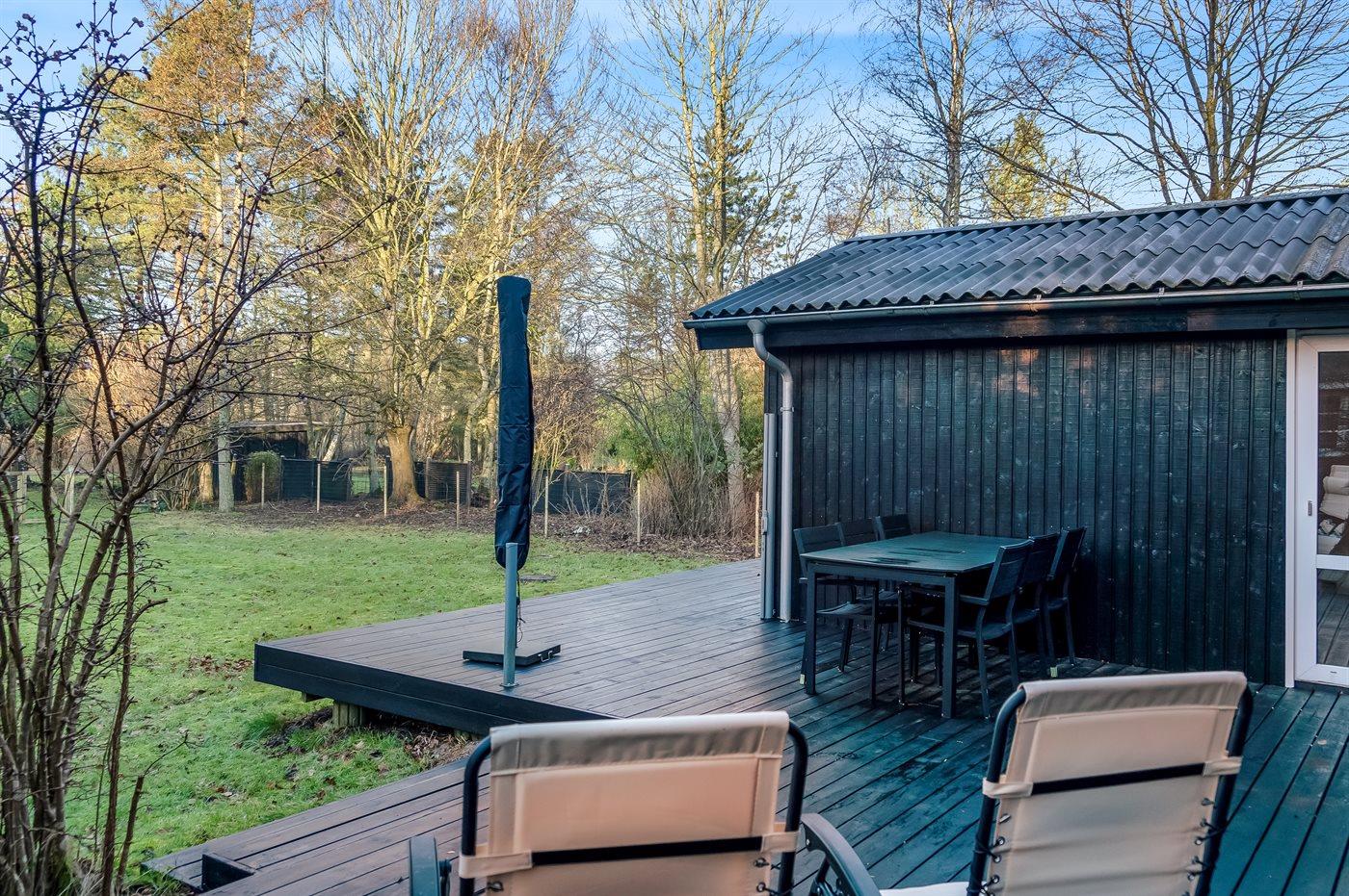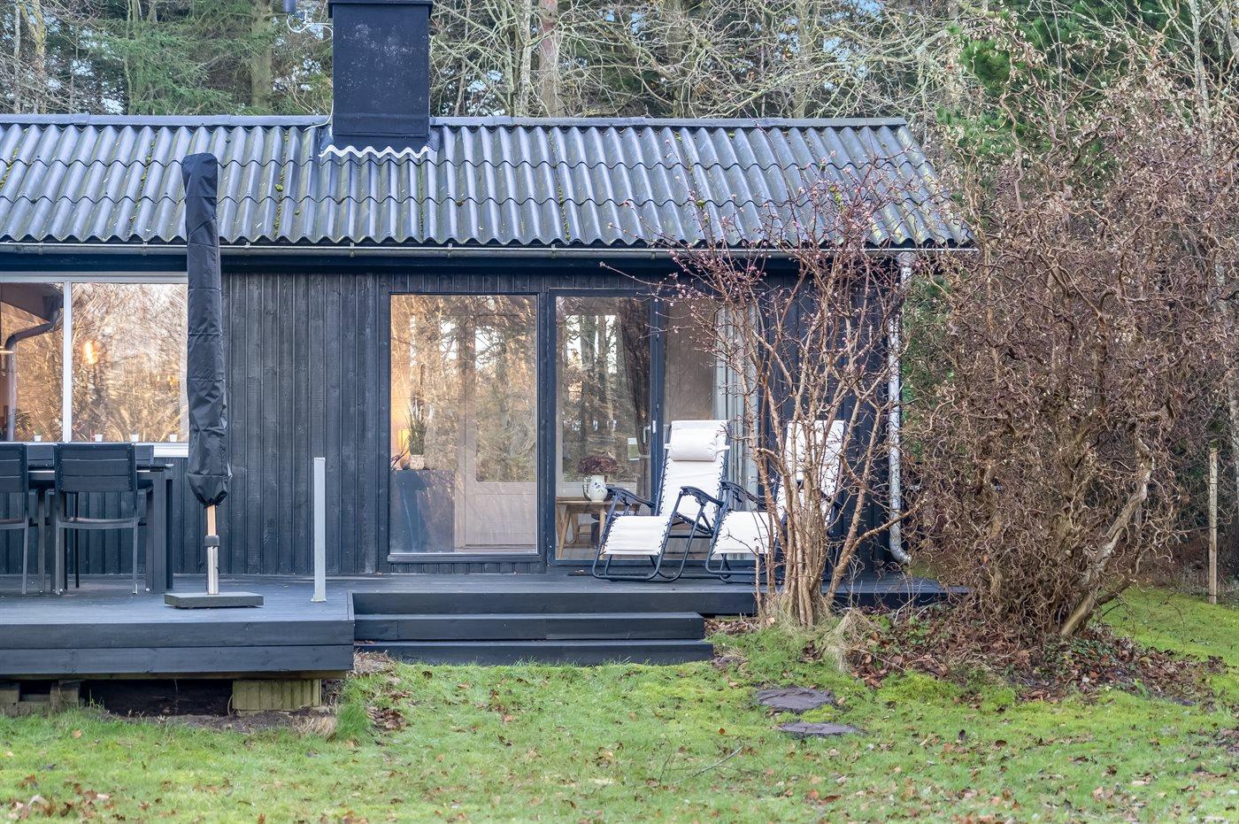 Udendørs er grunden fuldt indhegnet, så børn og kæledyr kan lege frit og trygt. I bunden af haven, bag hegnet, finder du en lille sø, der giver et ekstra strejf af natur. På terrassen kan du nyde måltider fra husets kulgrill og slappe af i de rolige omgivelser.