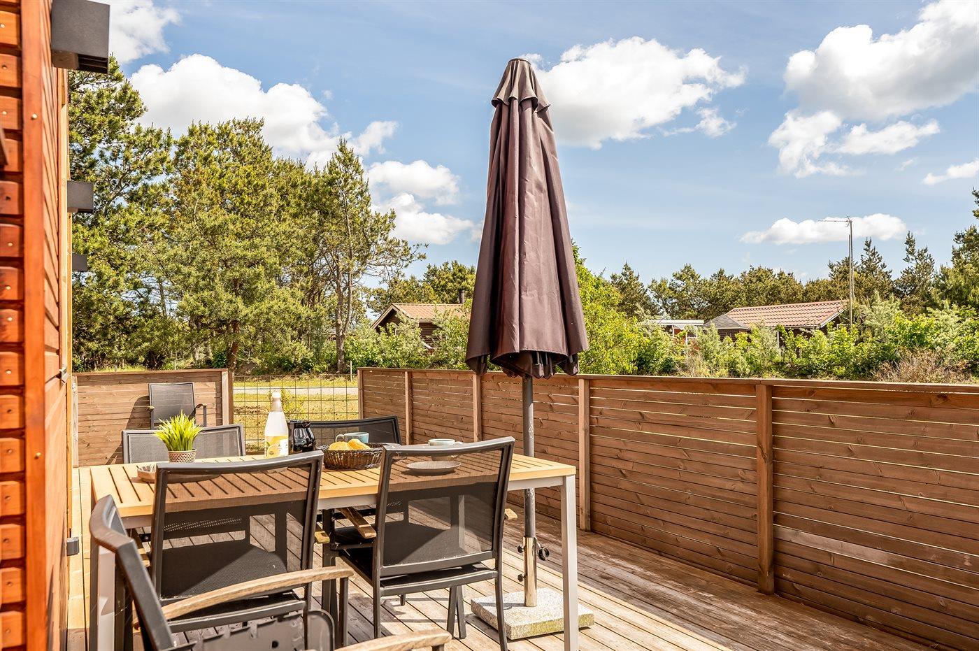 Ferieboligen er beliggende på en 935 m² stor naturgrund. Der er 200 m til havet. Nærmeste forretning er beliggende i en afstand af 5800 m. Til ferieboligen hører åbent terrasseareal. Desuden er der overdækket terrasse. Grill til rådighed. Parkering ved ferieboligen.