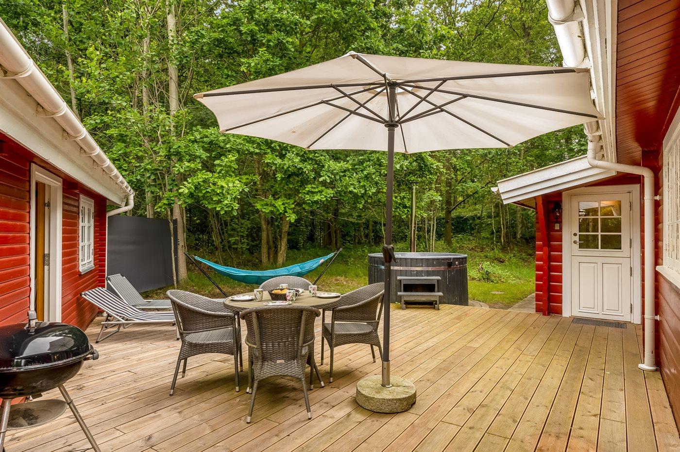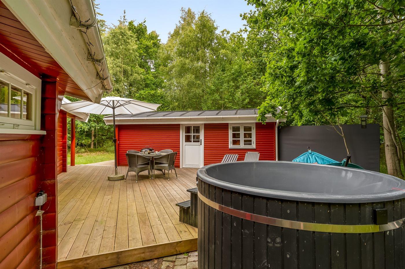 Dette skønne sommerhus er beliggende på en stor og naturskøn grund med masser af plads til afslapning og udeliv. Her finder du flere skønne terrasser, hvor du kan nyde solen i dagens løb – og når aftenen falder på, kan du slappe af i det dejlige vildmarkskar under åben himmel.