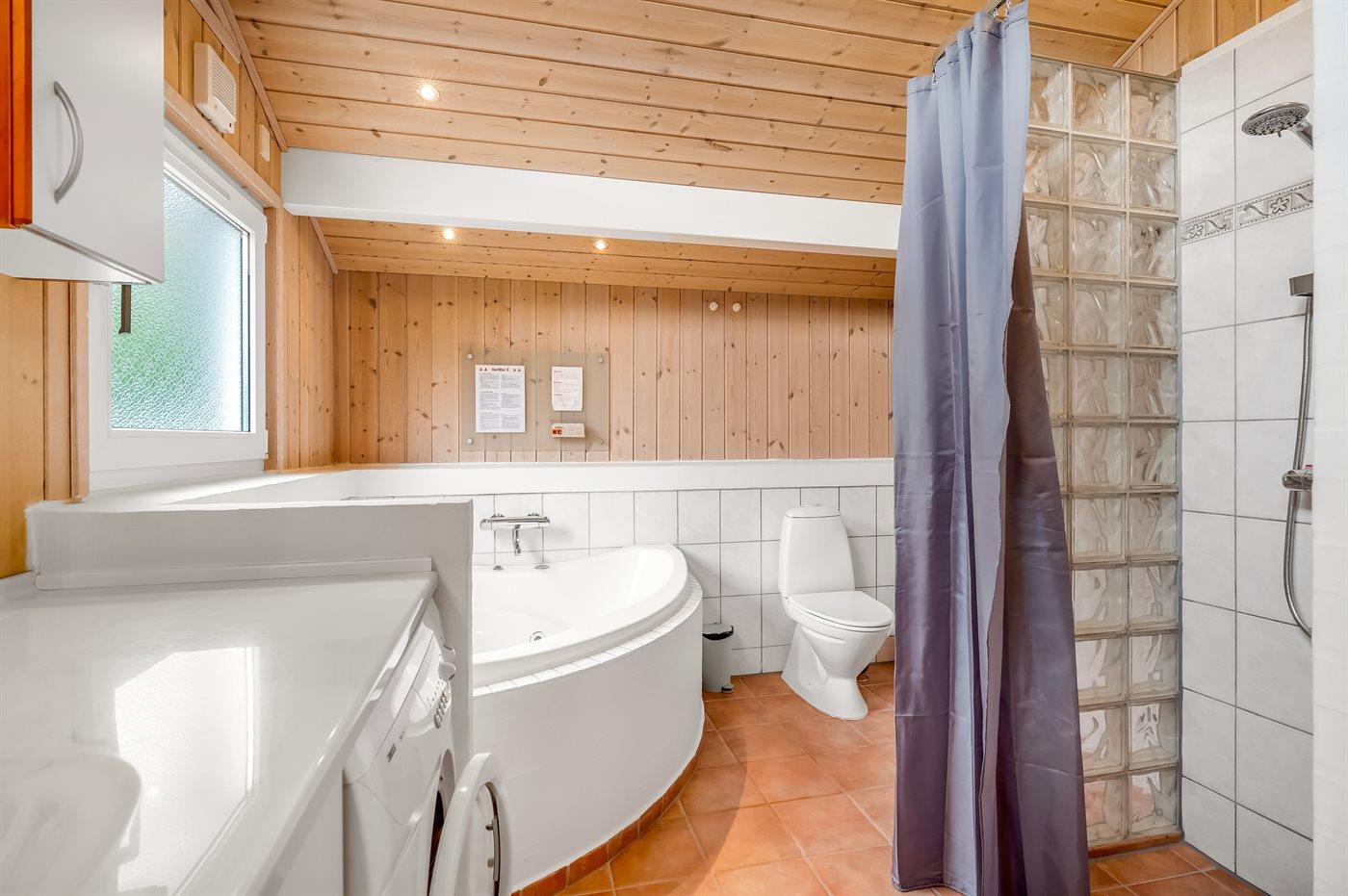 Der er 2 badeværelser med bruseniche og 2 toiletter. Der er gulvvarme på 2 badeværelser. I saunaen er der mulighed for afslapning.