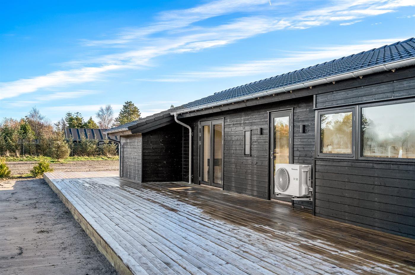 Ferieboligen er beliggende på en 2547 m² stor naturgrund. Der er 700 m til havet. Nærmeste forretning er beliggende i en afstand af 6200 m. Der er en golfbane i en afstand af 8100 m. Til ferieboligen hører åbent terrasseareal. Desuden er der overdækket terrasse. Der er redskabsrum. Udendørs bruser. Grill til rådighed. Der er installeret stik til opladning af elbil. Type 2 stik. Med 11 kW ladeeffekt. Parkering ved ferieboligen.