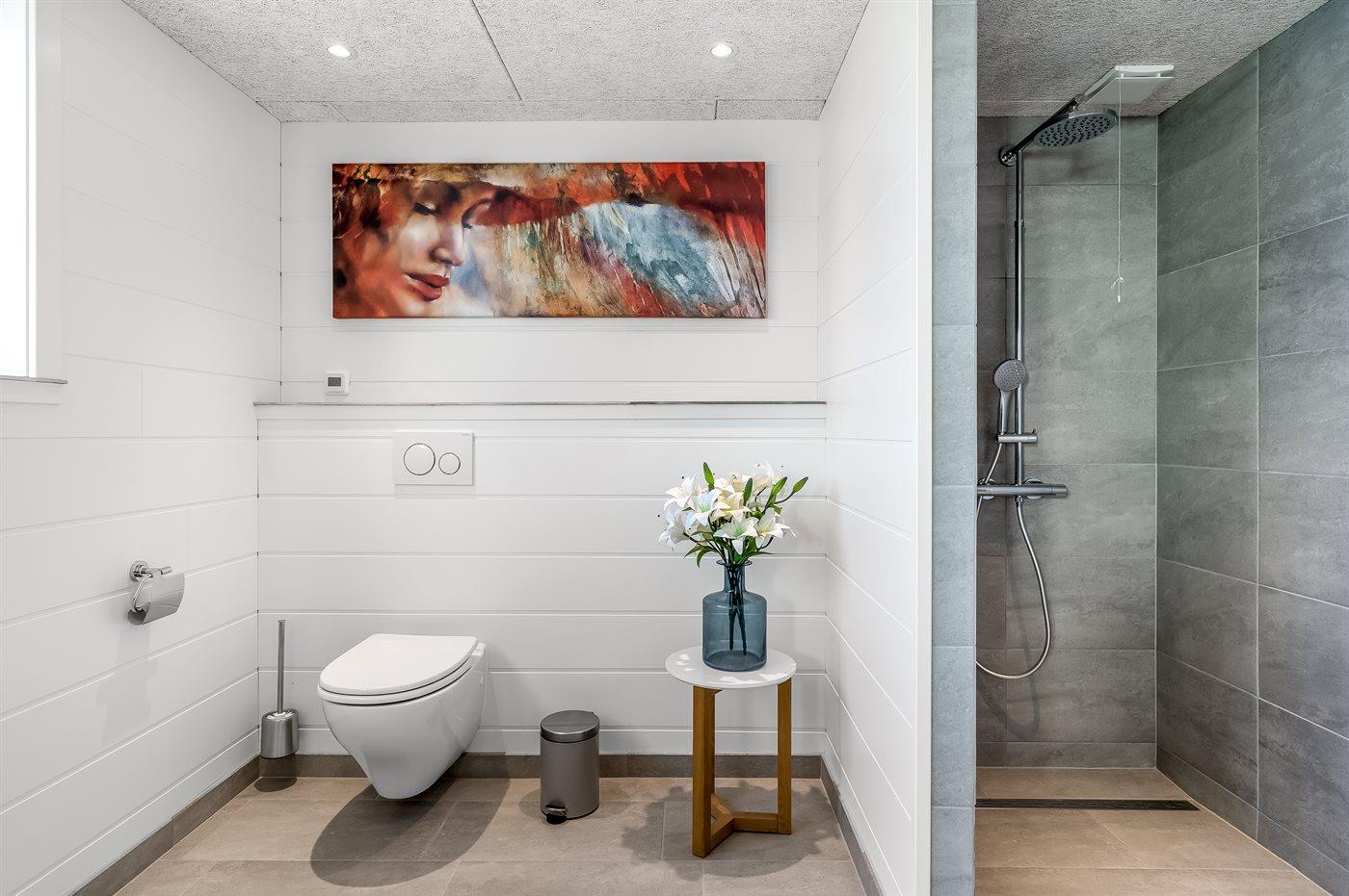 Der er 2 badeværelser med bruseniche og 2 toiletter. Der er gulvvarme på 2 badeværelser. I saunaen er der mulighed for afslapning.