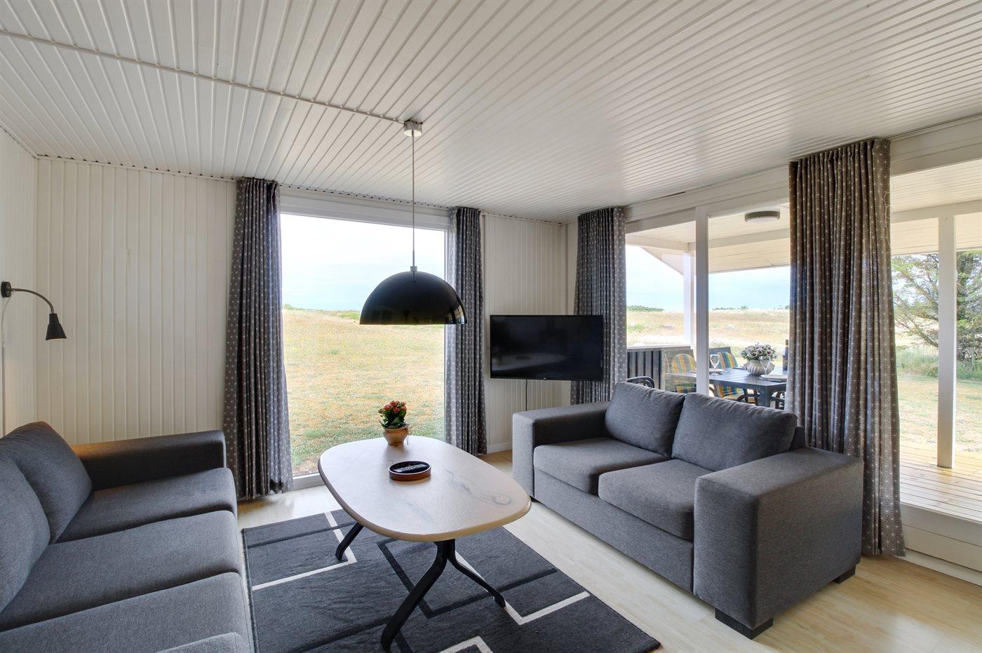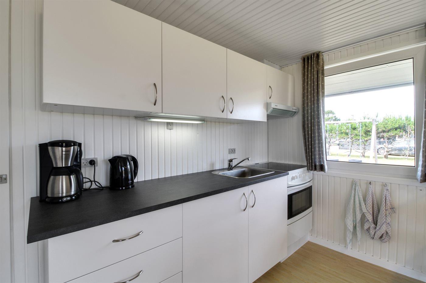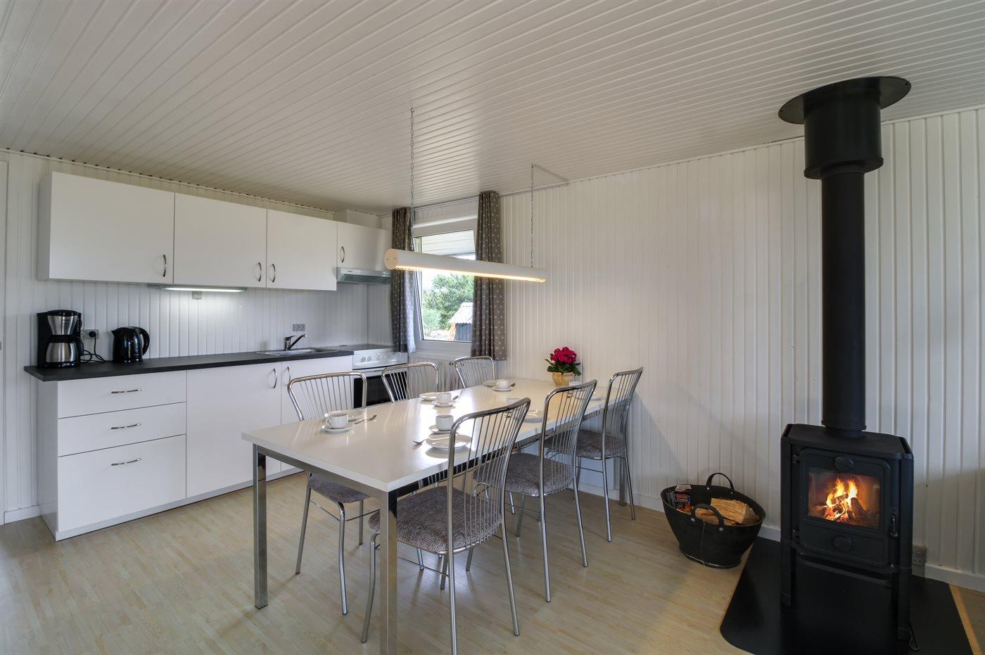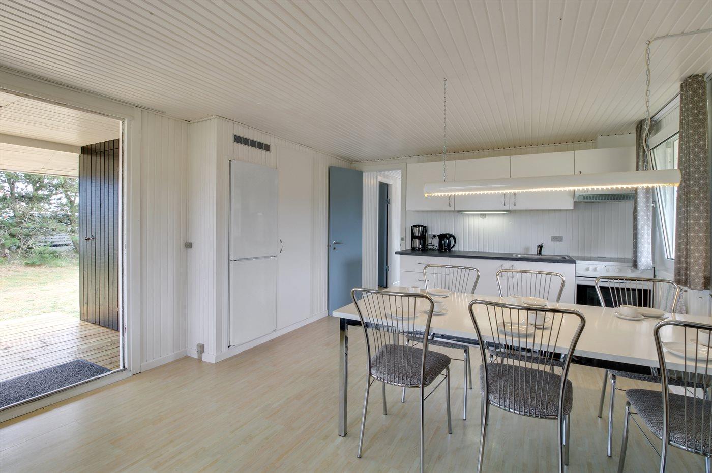 Huset er på 70 m2. Der er 6 sovepladser, som er fordelt på et soveværelse med dobbeltseng samt 2 værelser med køjesenge. Køkkenafdeling med komfur/ovn, mikroovn, kaffemaskine, elkedel samt stort køle/fryseskab. Opholdsstue med brændeovn, TV med mange danske kanaler og parabol med masser af tyske kanaler. Nyere badeværelse (2020) med bruseniche og gulvvarme. Der forefindes vaskemaskine, barneseng samt barnestol.