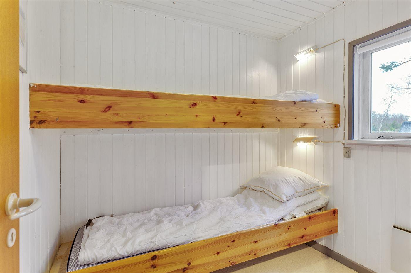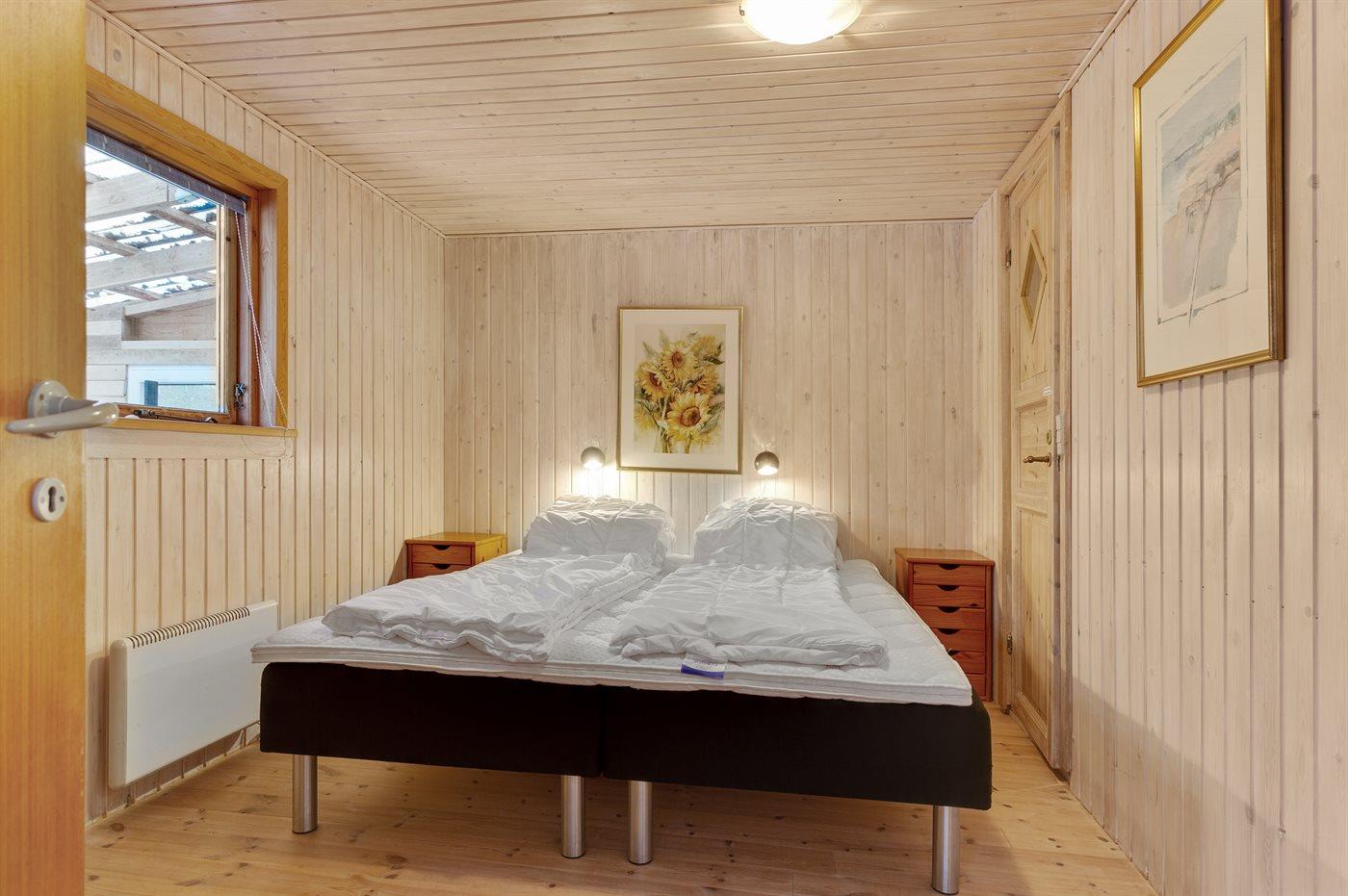 Der er i alt 3 soveværelser. Sovepladserne fordeler sig på: 4 sovepladser i dobbeltsenge. 2 sovepladser i køjeseng. Derudover er der 1 stk. barneseng.