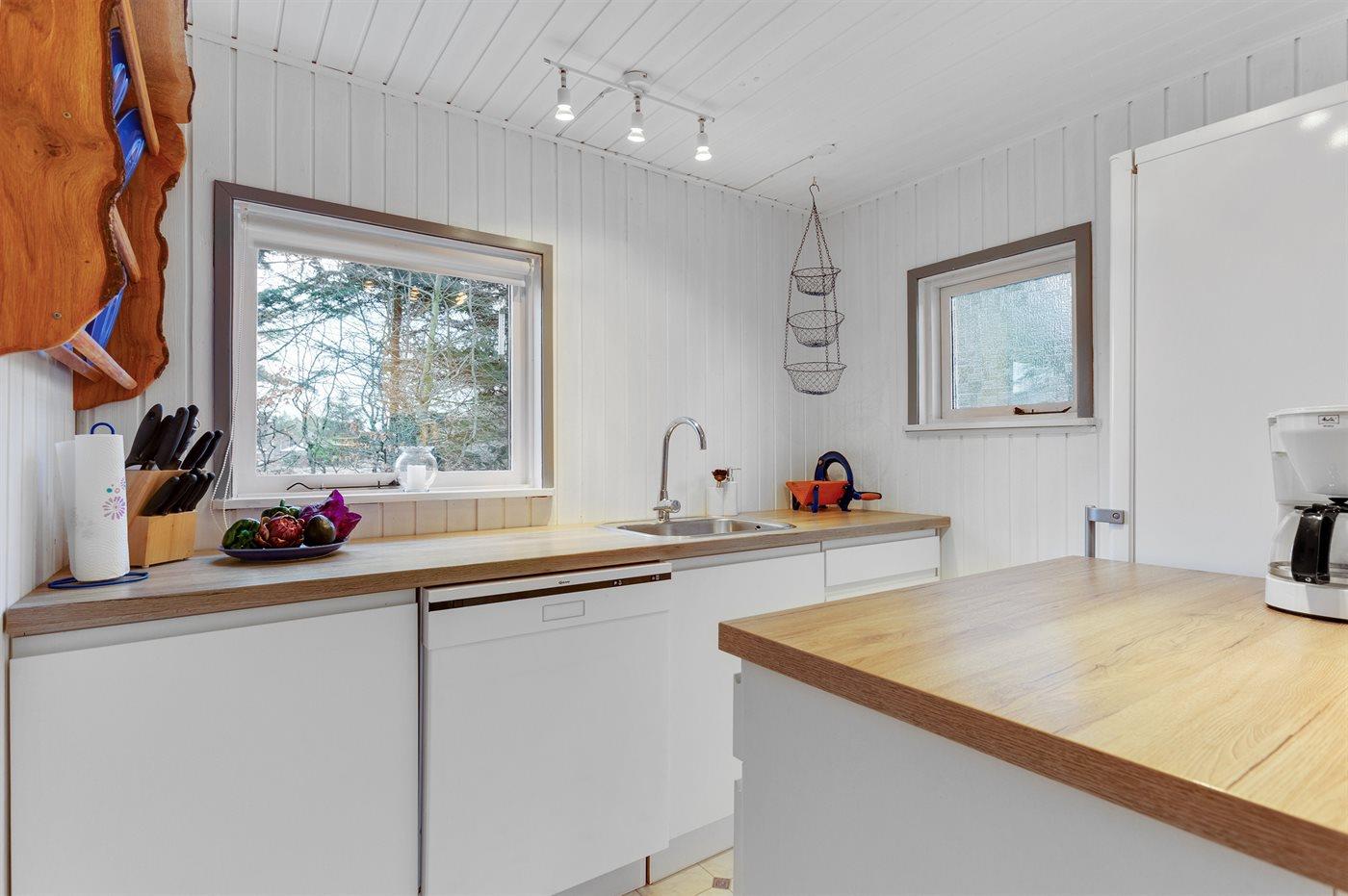 Køkkenet er udstyret med 1 køleskab. Der er 4 keramiske kogeplader, varmluftovn, mikrobølgeovn samt opvaskemaskine.