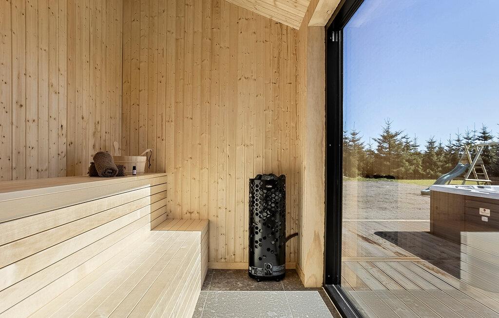 Rummeligt feriehus nær stranden med sauna, spabad og aktivitetsrum til afslapning og sjov.