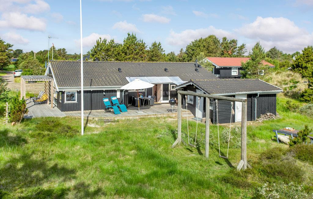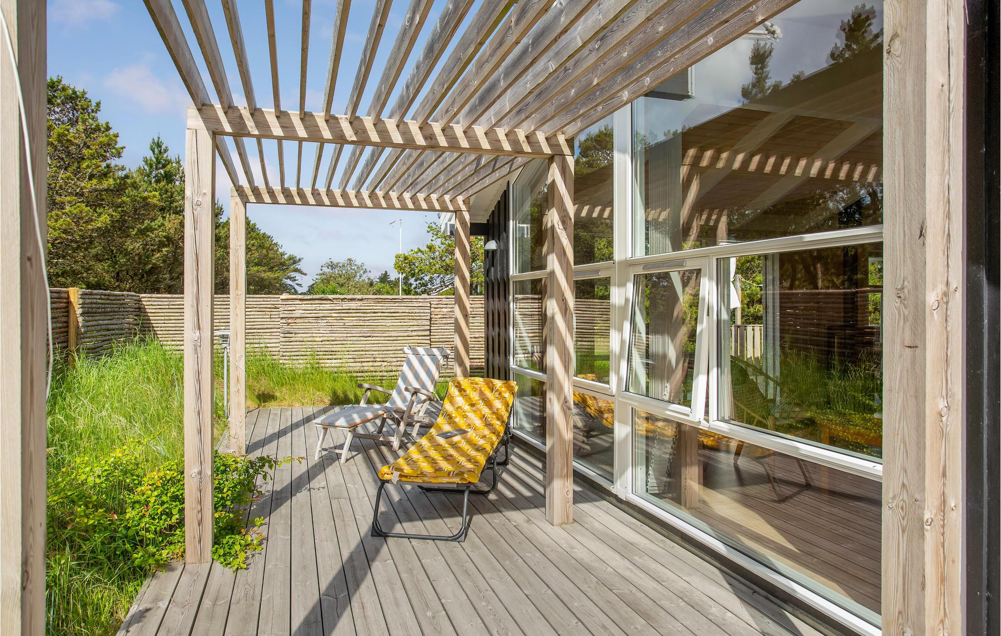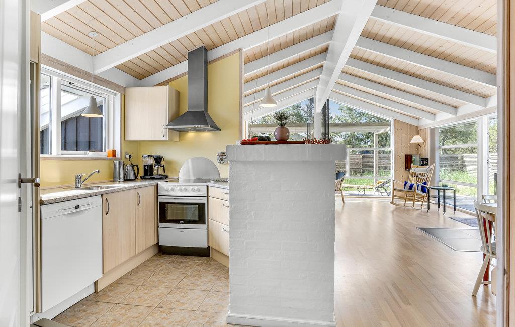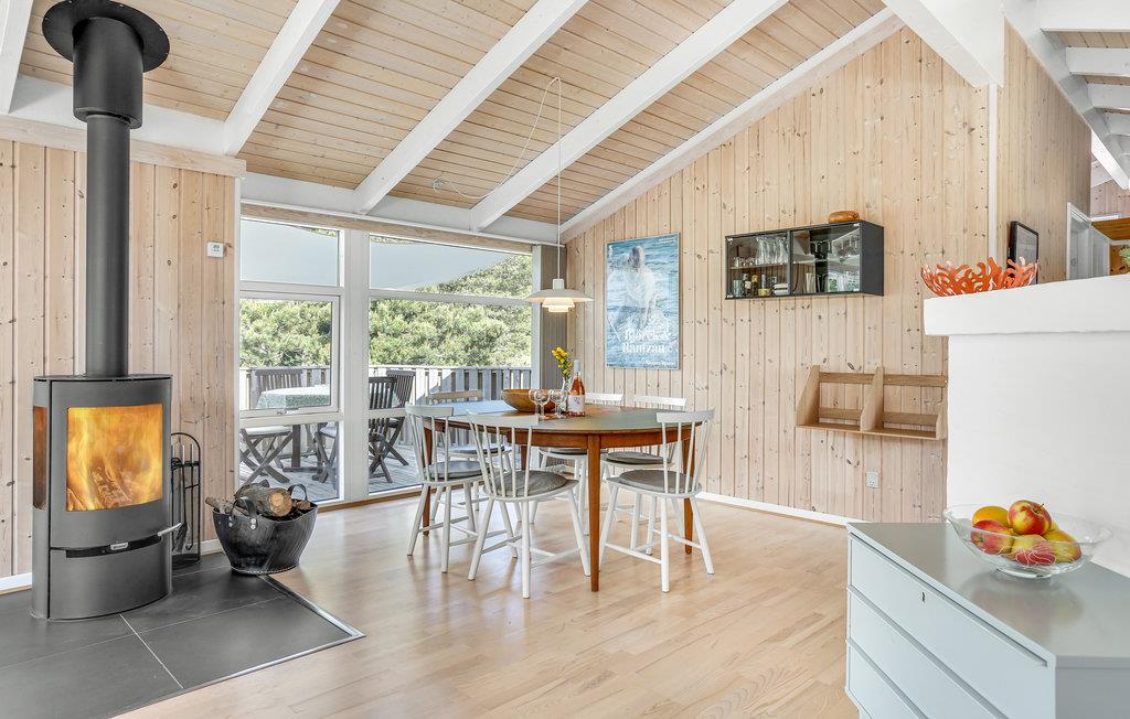 Bag den yderste klitrække venter dette dejlige feriehus på jer. Feriehuset fremtræder lyst og indbydende med et åbent boligkoncept, højt til loftet og en store vinduespartier, der alt sammen bidrager til at skabe en virkelig lys og luftig følelse her. For lidt ekstra hygge kan I tænde op i brændeovnen på de køligere dage, ved hvis varme I kan læse en god bog eller købe snacks til den store filmaften.