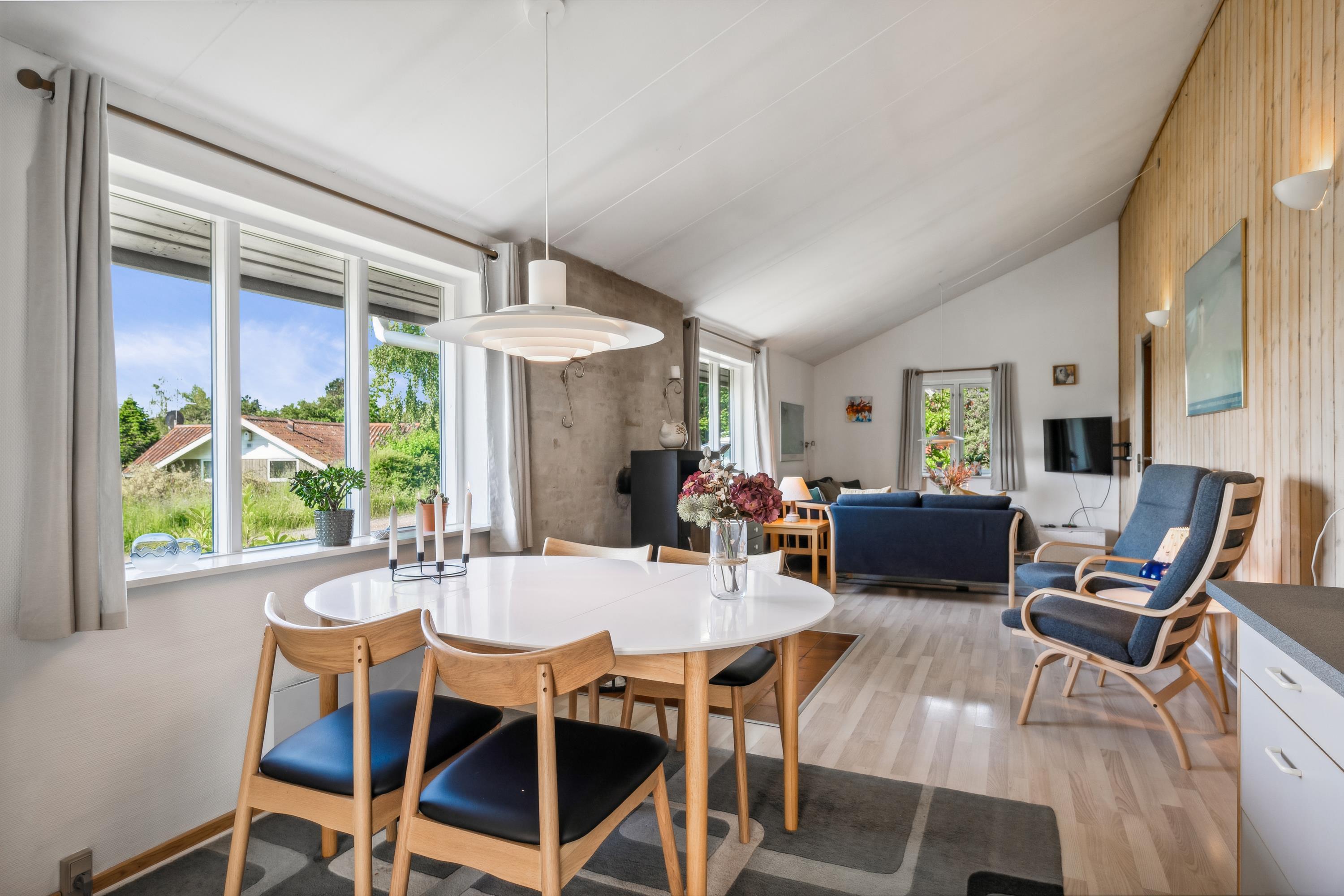 Blot 10 min kørsel fra Ebeltoft finder man dette hyggelige feriehus. Her finder man en lys stue møbleret med gode møbler og brændeovn. Dejlig spiseafdeling i forbindelse med det funktionelle køkken med b.la. opvaskemaskine. Herfra er der udgang til en stor møbleret udestue og terrasse. Husets sovepladser finder man i tre gode soveværelser, heraf to værelser med enkeltsenge og et værelse med en dobbeltseng. To badeværelser med bruseniche. Til de små feriegæster er der en høj barnestol og en barneseng. Såvel fra hus som fra grunden er den den smukkeste udsigt over søen og landskabet.