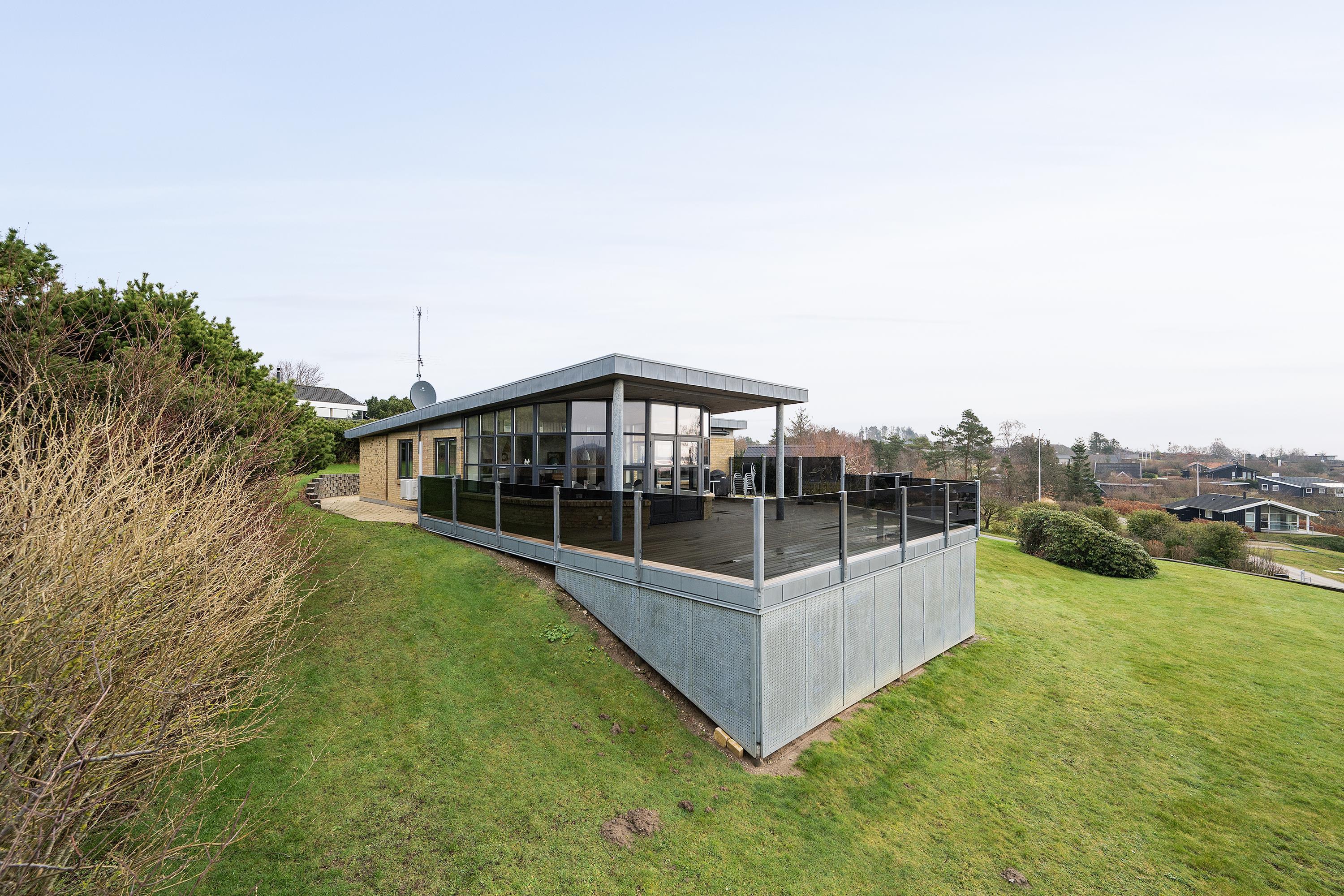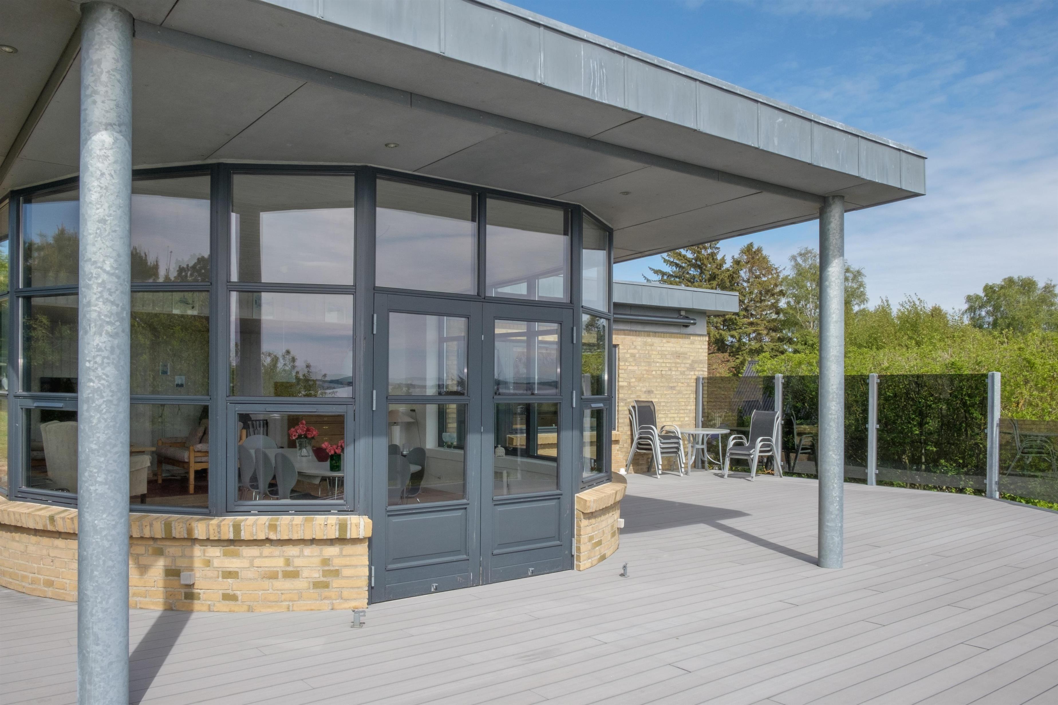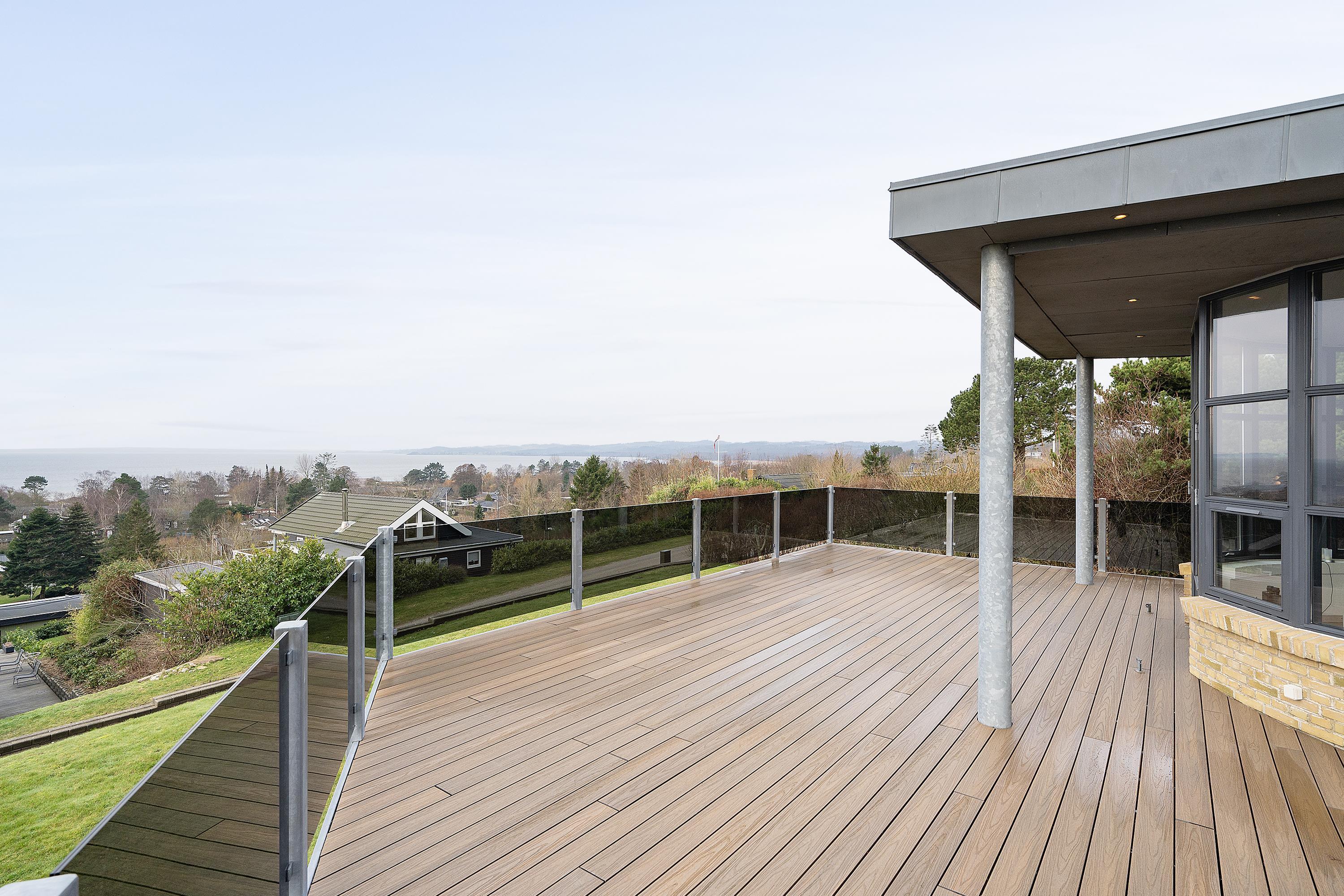 Dette usædvanligt rummelige, lyse og skønne feriehus ligger højt på skrånende og velplejet naturgrund i bakkerne ved Handrup Strand med panoramaudsigt over Ebeltoft Vig. Stor, lukket udsigtsterrasse med udgang fra den nytilbyggede spisestue, der også fungerer som havestue med panoramaudsigt. Terrassen har havemøbler, liggestole, parasol og grill. Et helt specielt og gennemført hus.